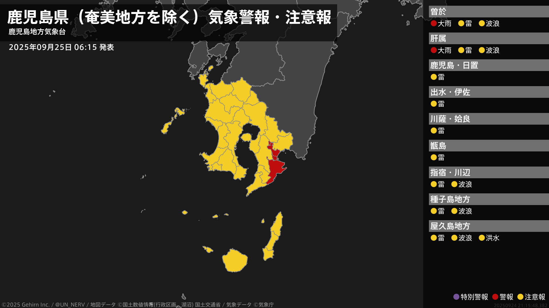 【鹿児島県(奄美地方を除く) 気象警報・注意報 2025年09月25日 06:15】大隅地方では、25日昼前まで土砂災害に警戒してください。#気象警報注意報 #鹿児島県(奄美地方除く)