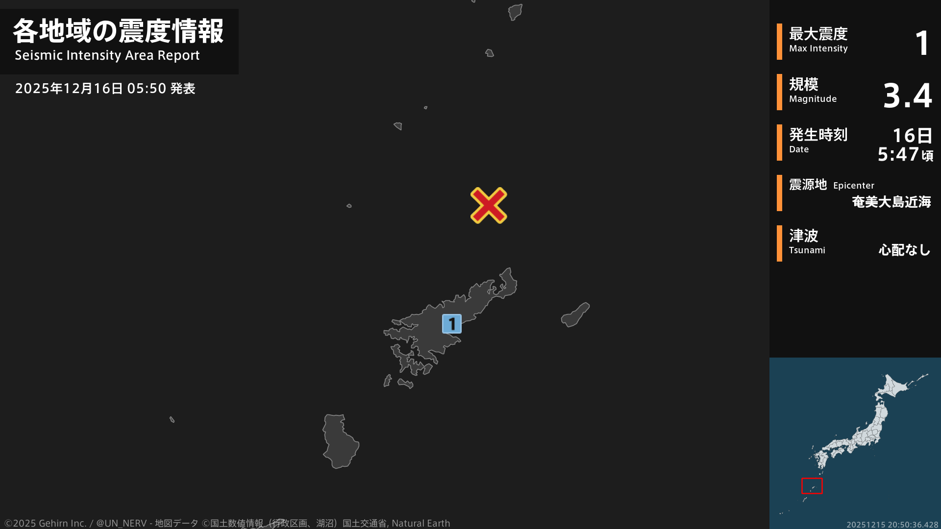 5時47分頃、奄美大島近海を震源とする地震がありました。震源の深さは約20km、地震の規模はM3.4、最大震度1を鹿児島県で観測しています。この地震による津波の心配はありません。