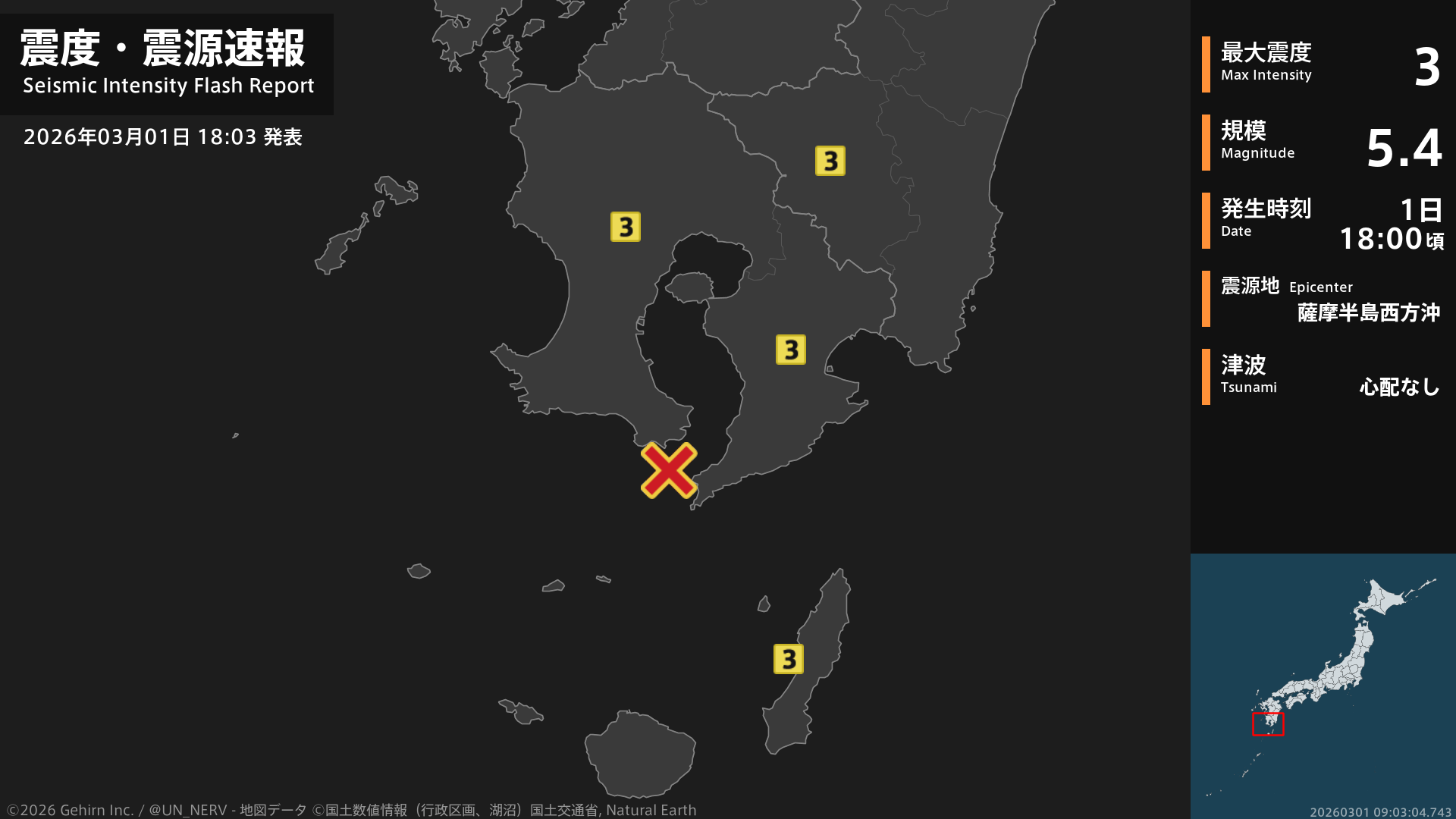 18時0分頃、薩摩半島西方沖を震源とする地震がありました。震源の深さは約130km、地震の規模はM5.4、最大震度3を宮崎県、鹿児島県で観測しています。この地震による津波の心配はありません。