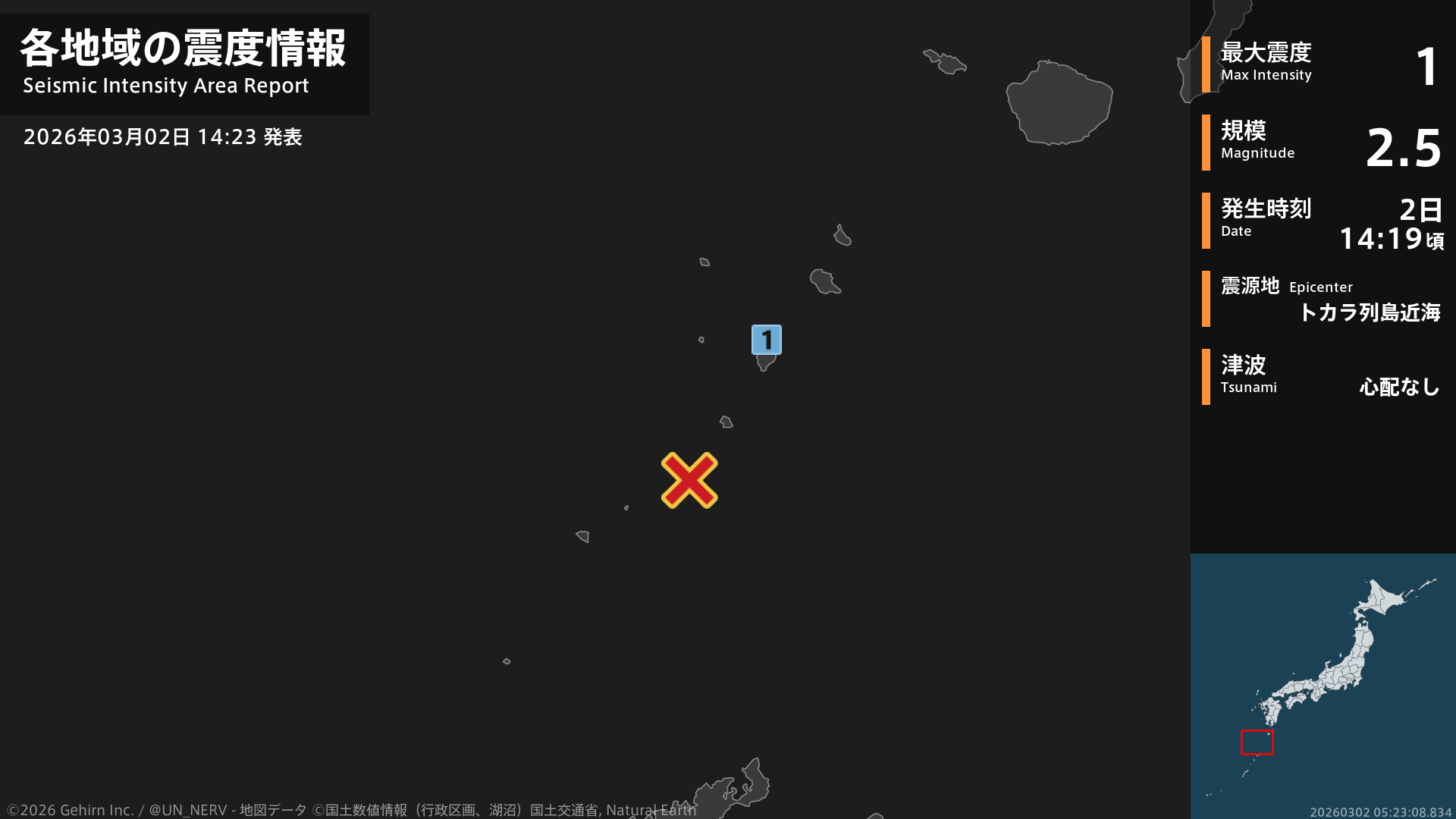 14時19分頃、トカラ列島近海を震源とする地震がありました。震源の深さは約20km、地震の規模はM2.5、最大震度1を鹿児島県で観測しています。この地震による津波の心配はありません。