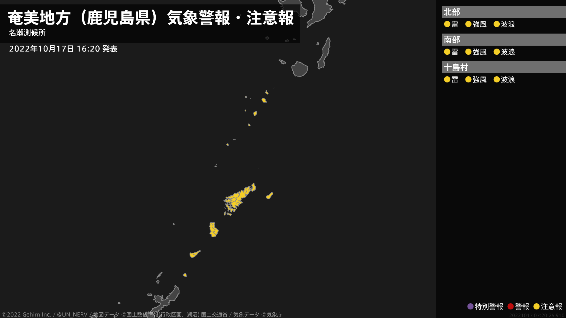 【奄美地方(鹿児島県) 気象警報・注意報 2022年10月17日 16:20】奄美地方では、強風や高波、急な強い雨、落雷に注意してください。#気象警報注意報 #奄美地方