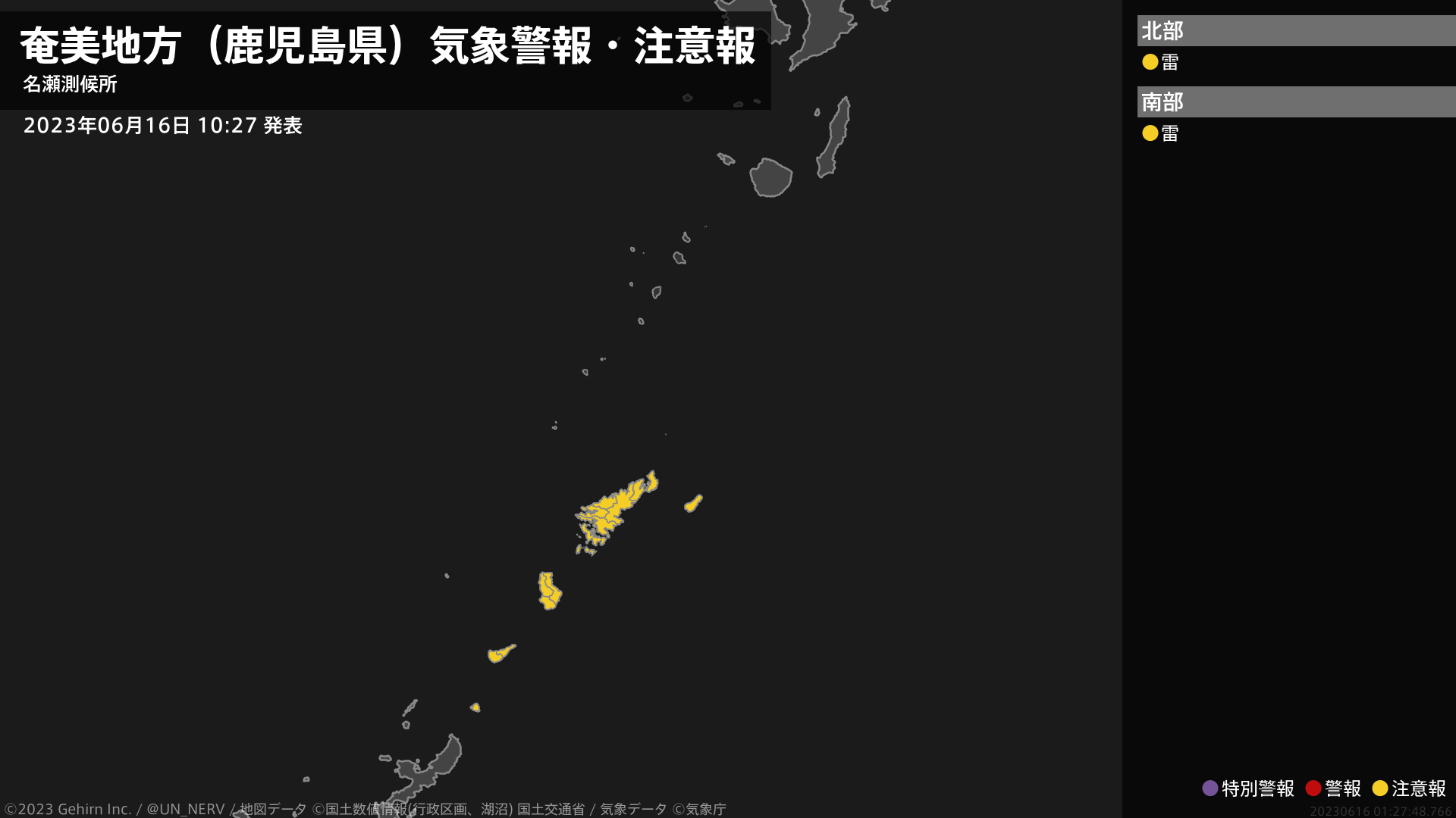 【奄美地方(鹿児島県) 気象警報・注意報 2023年06月16日 10:27】
