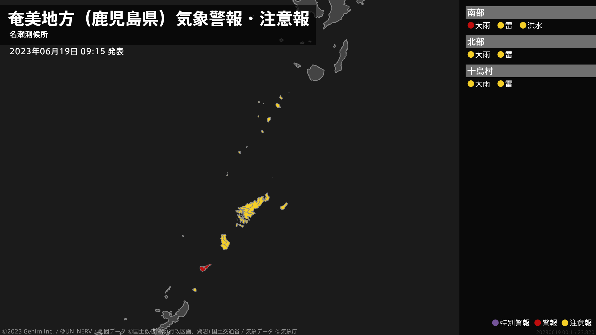 【奄美地方(鹿児島県) 気象警報・注意報 2023年06月19日 09:15】奄美地方では、19日夕方まで土砂災害に、19日昼過ぎまで低い土地の浸水に警戒してください。#気象警報注意報 #奄美地方