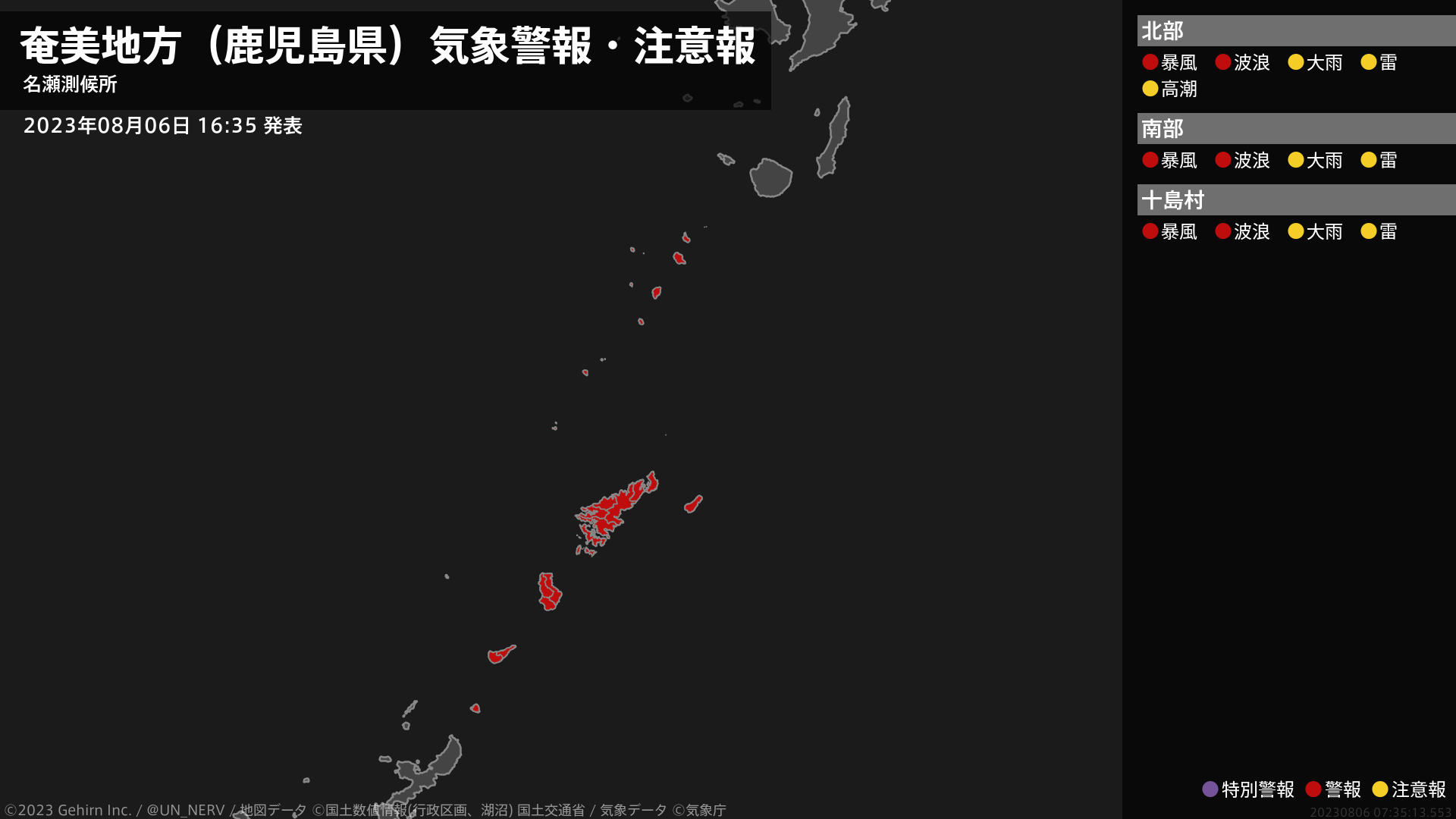 【奄美地方(鹿児島県) 気象警報・注意報 2023年08月06日 16:35】奄美地方では、暴風や高波に警戒してください。#気象警報注意報 #奄美地方