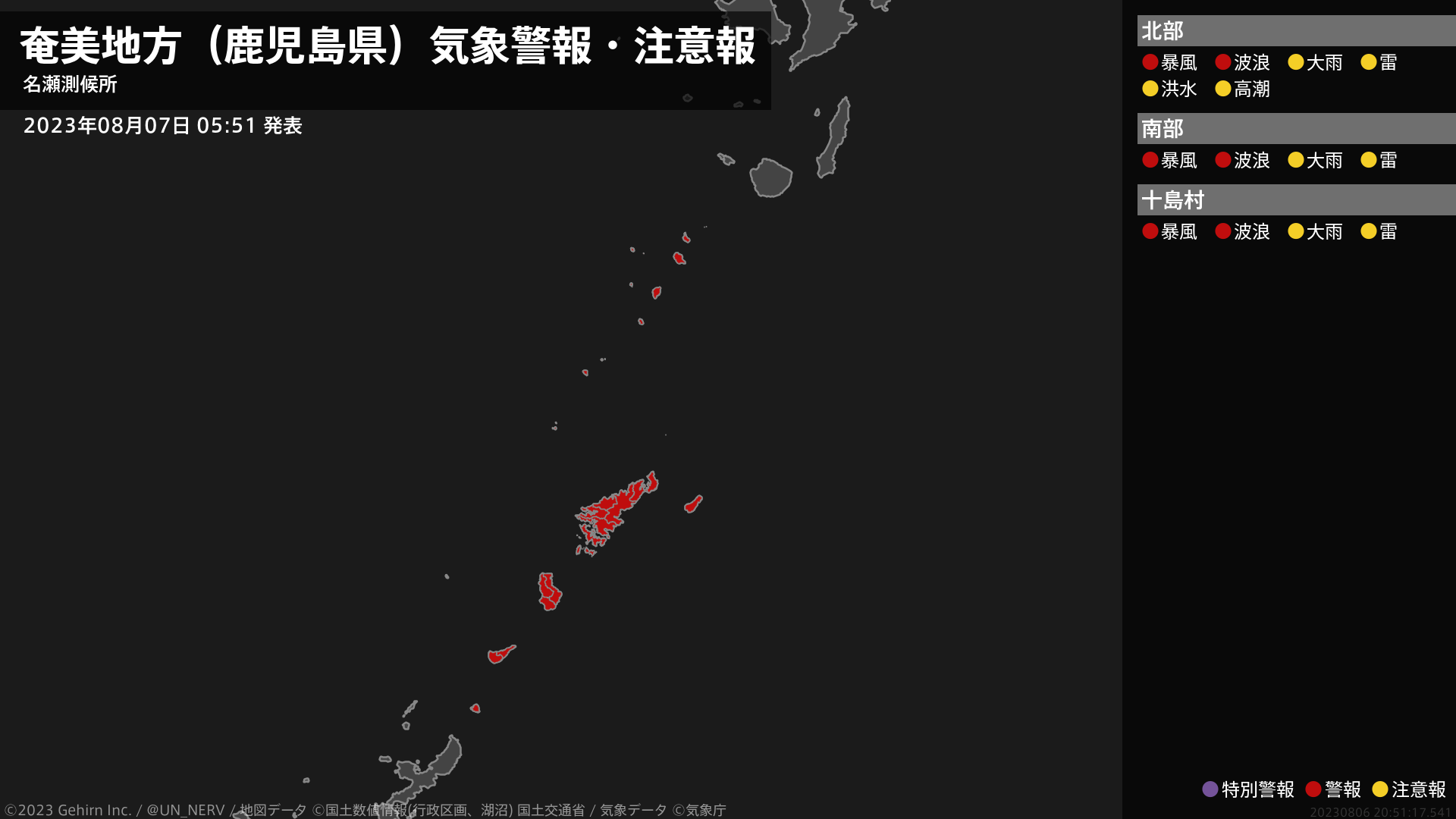 【奄美地方(鹿児島県) 気象警報・注意報 2023年08月07日 02:51】奄美地方では、暴風や高波に警戒してください。#気象警報注意報 #奄美地方