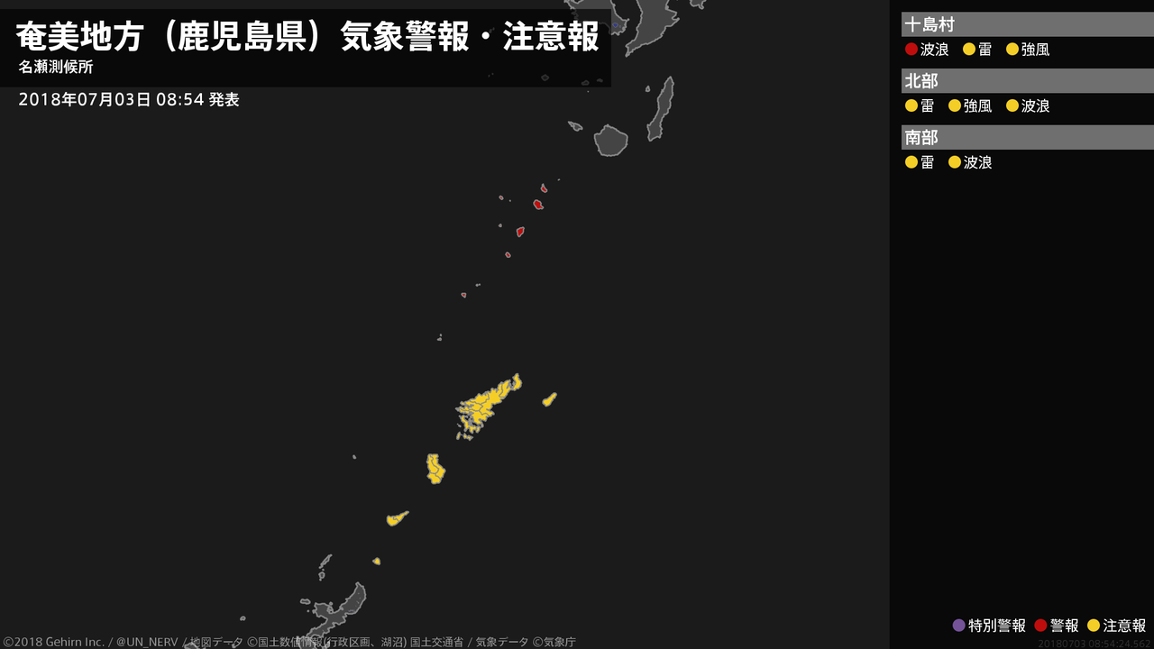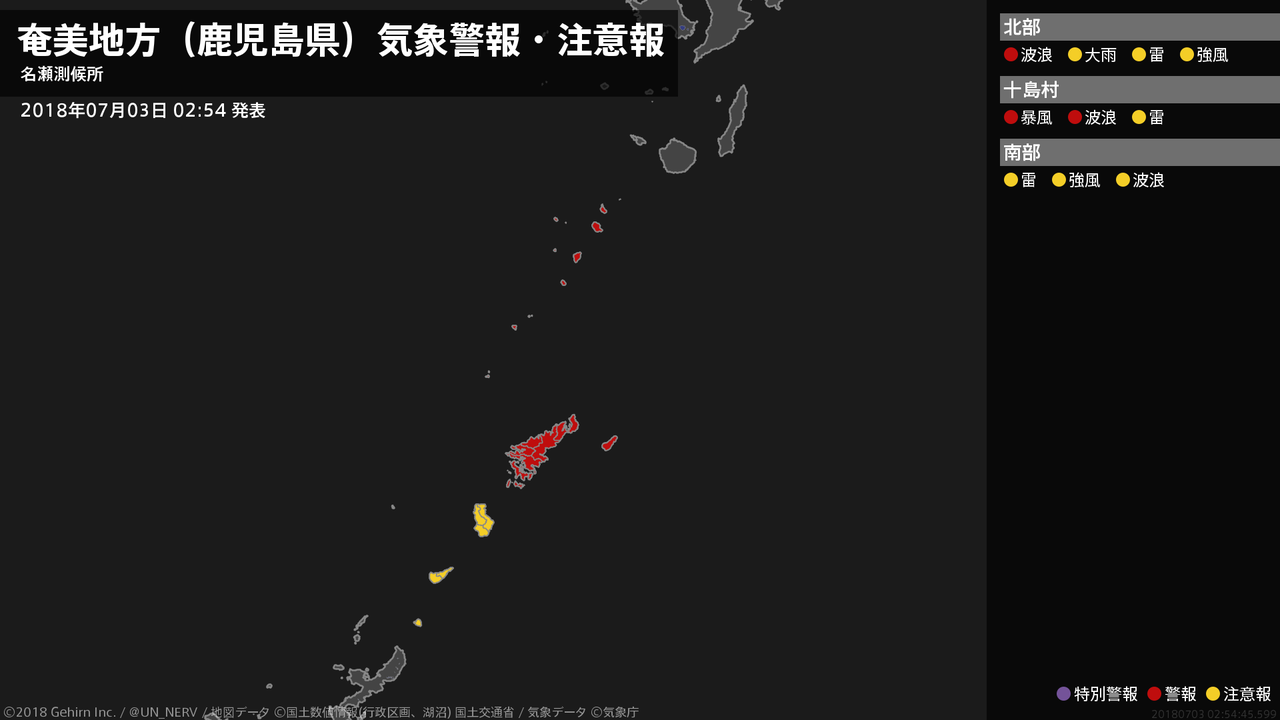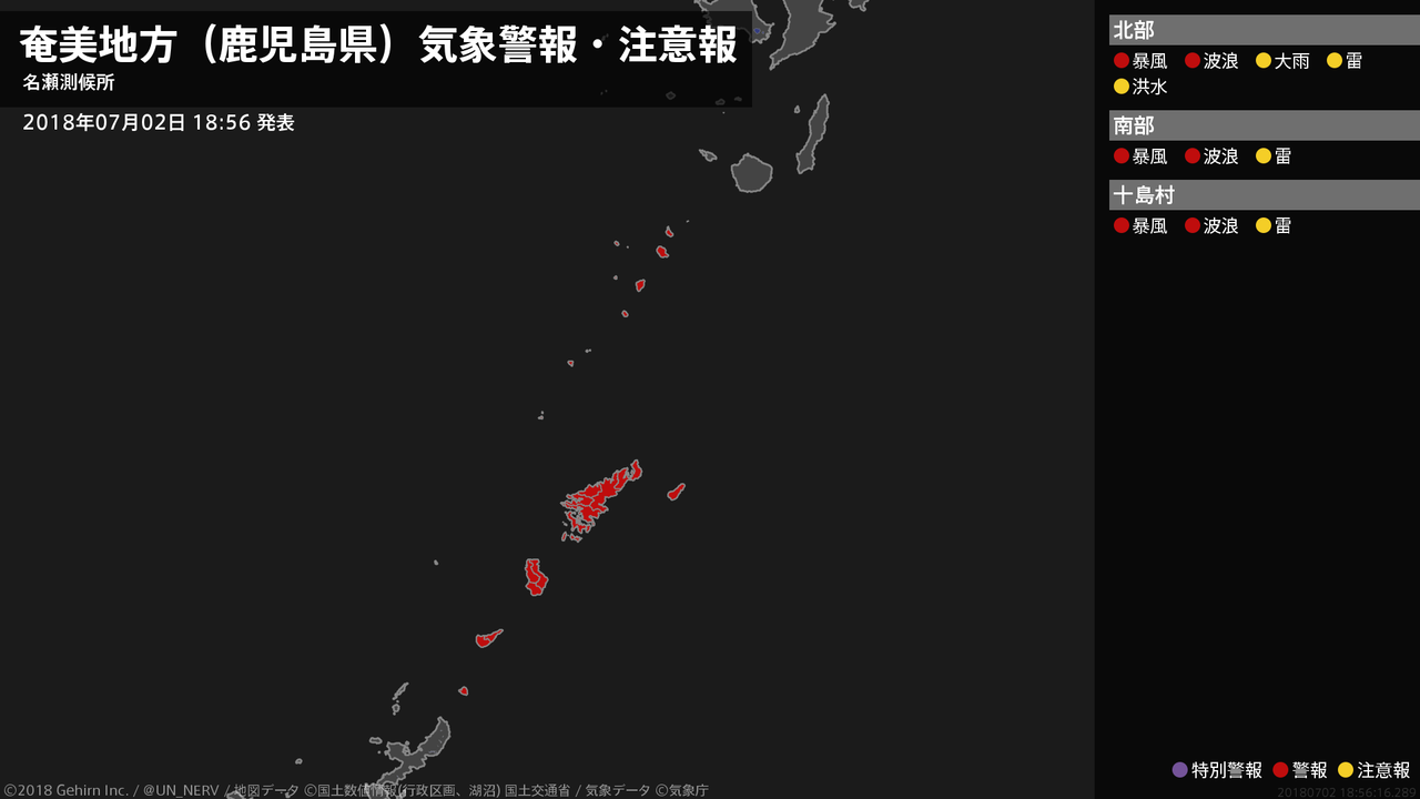 【奄美地方(鹿児島県) 気象警報 2018年07月02日 23:49】奄美地方では、3日明け方まで暴風に、3日昼前まで高波に警戒してください。#気象警報 #気象警報注意報 #奄美地方