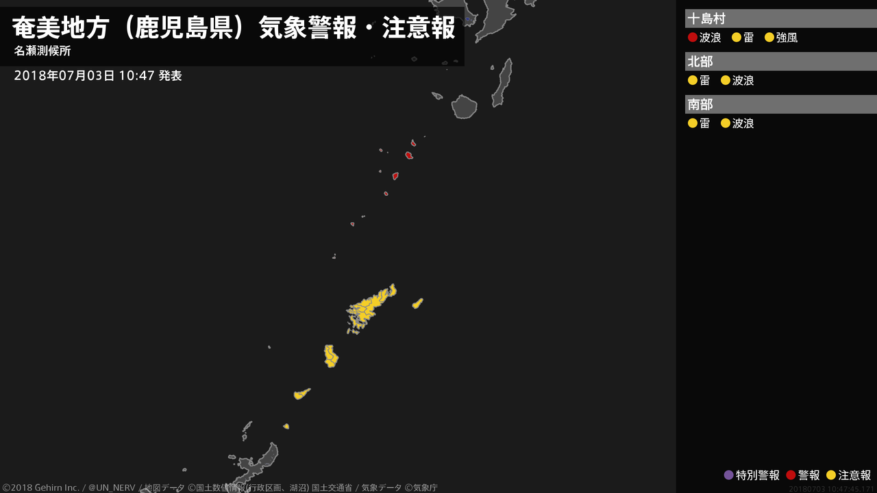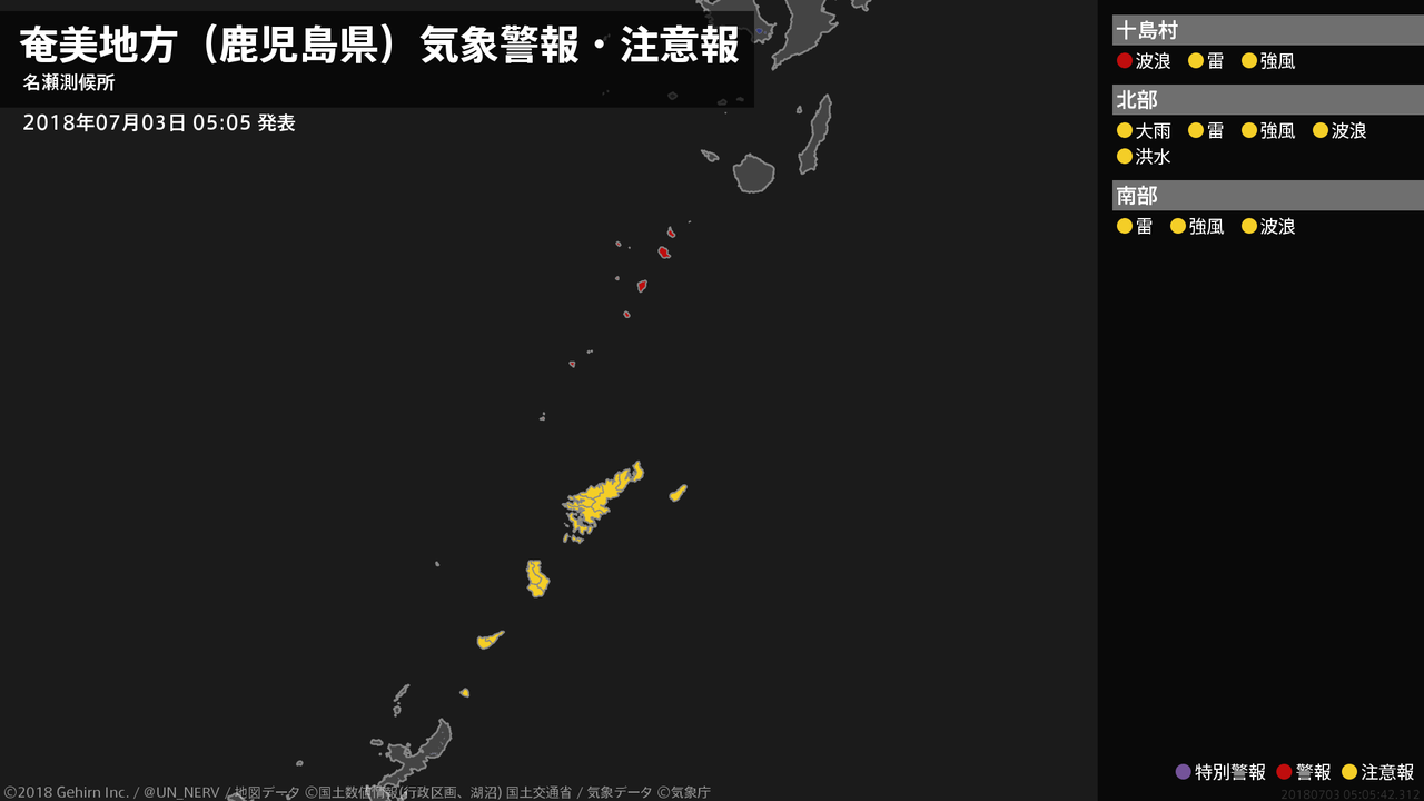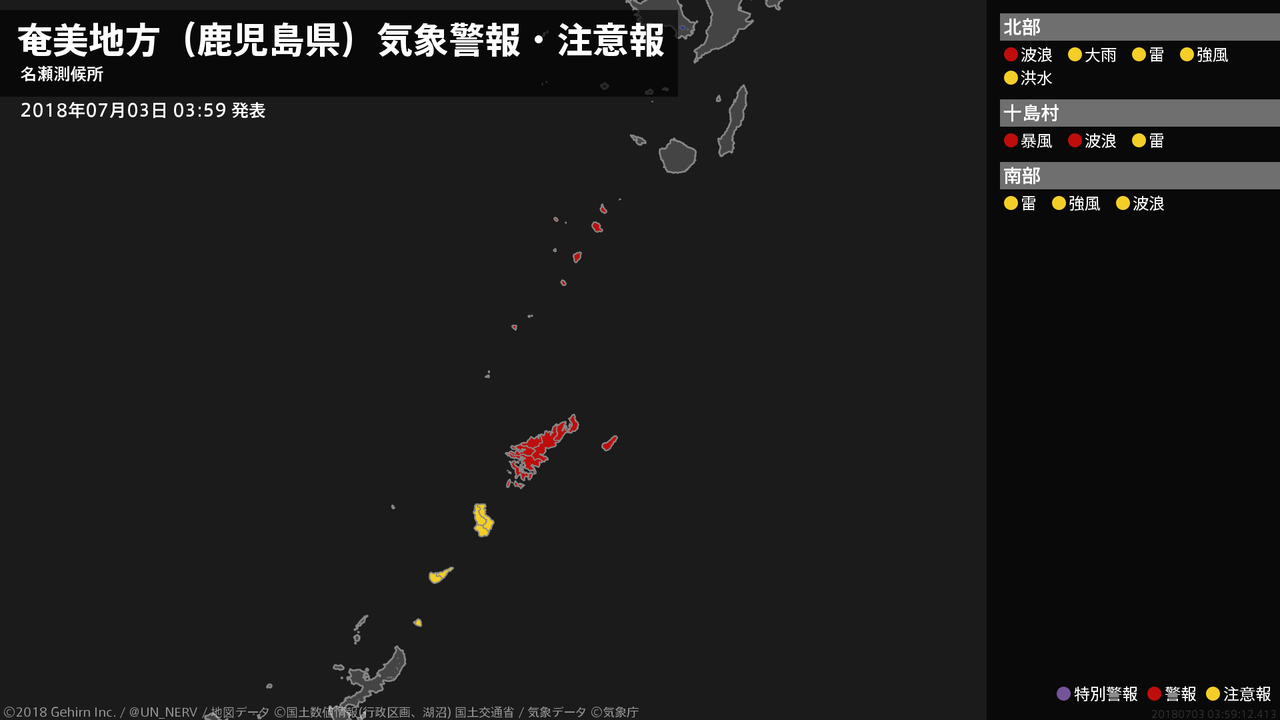 【奄美地方(鹿児島県) 気象警報・注意報 2018年07月03日 03:59】奄美地方では、3日明け方まで暴風に、3日昼前まで高波に警戒してください。#気象警報注意報 #奄美地方