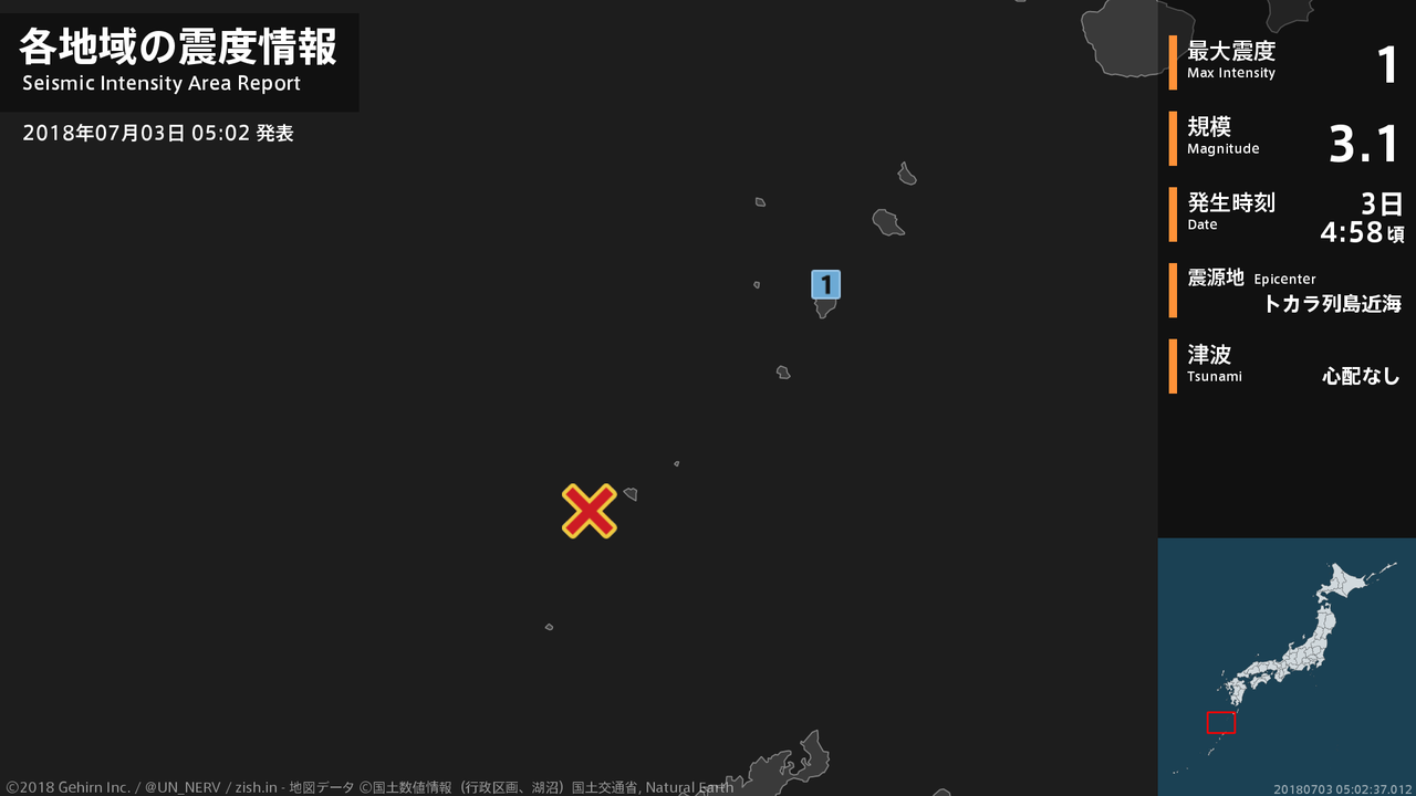 【地震情報 2018年7月3日】4時58分頃、トカラ列島近海を震源とする地震がありました。震源の深さは約10km、地震の規模はM3.1、最大震度1を鹿児島県で観測しています。この地震による津波の心配はありません。#地震 #鹿児島県