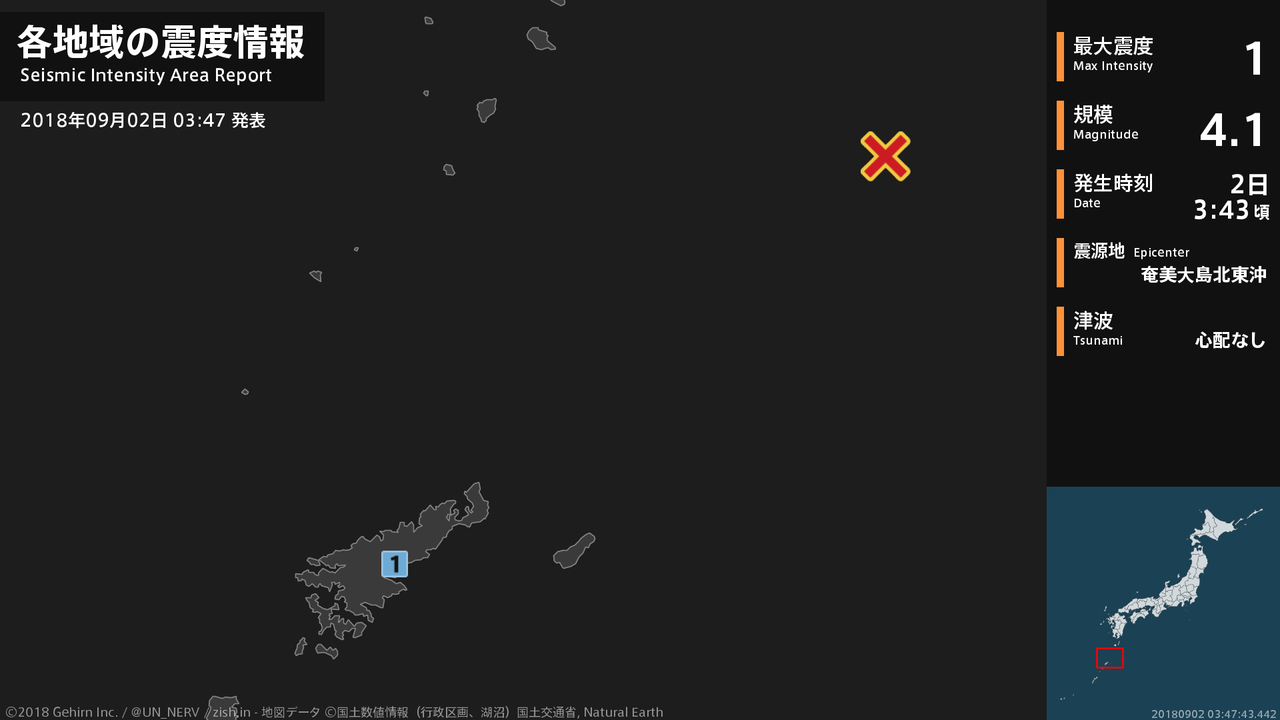 【地震情報 2018年9月2日】3時43分頃、奄美大島北東沖を震源とする地震がありました。震源の深さは約70km、地震の規模はM4.1、最大震度1を鹿児島県で観測しています。この地震による津波の心配はありません。#地震 #鹿児島県