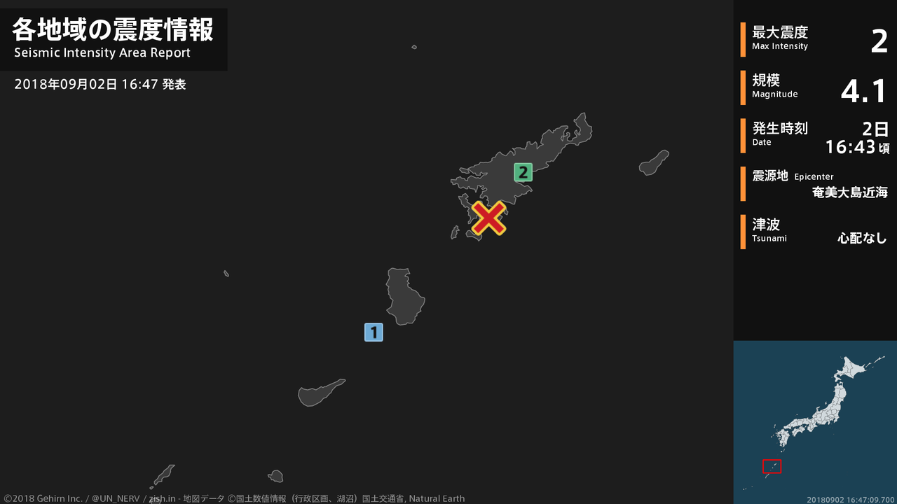 【地震情報 2018年9月2日】16時43分頃、奄美大島近海を震源とする地震がありました。震源の深さは約30km、地震の規模はM4.1、最大震度2を鹿児島県で観測しています。この地震による津波の心配はありません。#地震 #鹿児島県