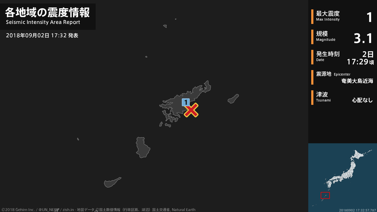 【地震情報 2018年9月2日】17時29分頃、奄美大島近海を震源とする地震がありました。震源の深さは約40km、地震の規模はM3.1、最大震度1を鹿児島県で観測しています。この地震による津波の心配はありません。#地震 #鹿児島県