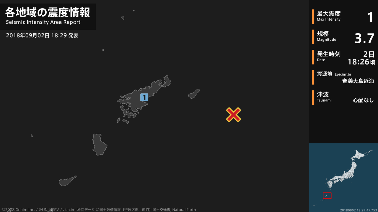 【地震情報 2018年9月2日】18時26分頃、奄美大島近海を震源とする地震がありました。震源の深さは約10km、地震の規模はM3.7、最大震度1を鹿児島県で観測しています。この地震による津波の心配はありません。#地震 #鹿児島県