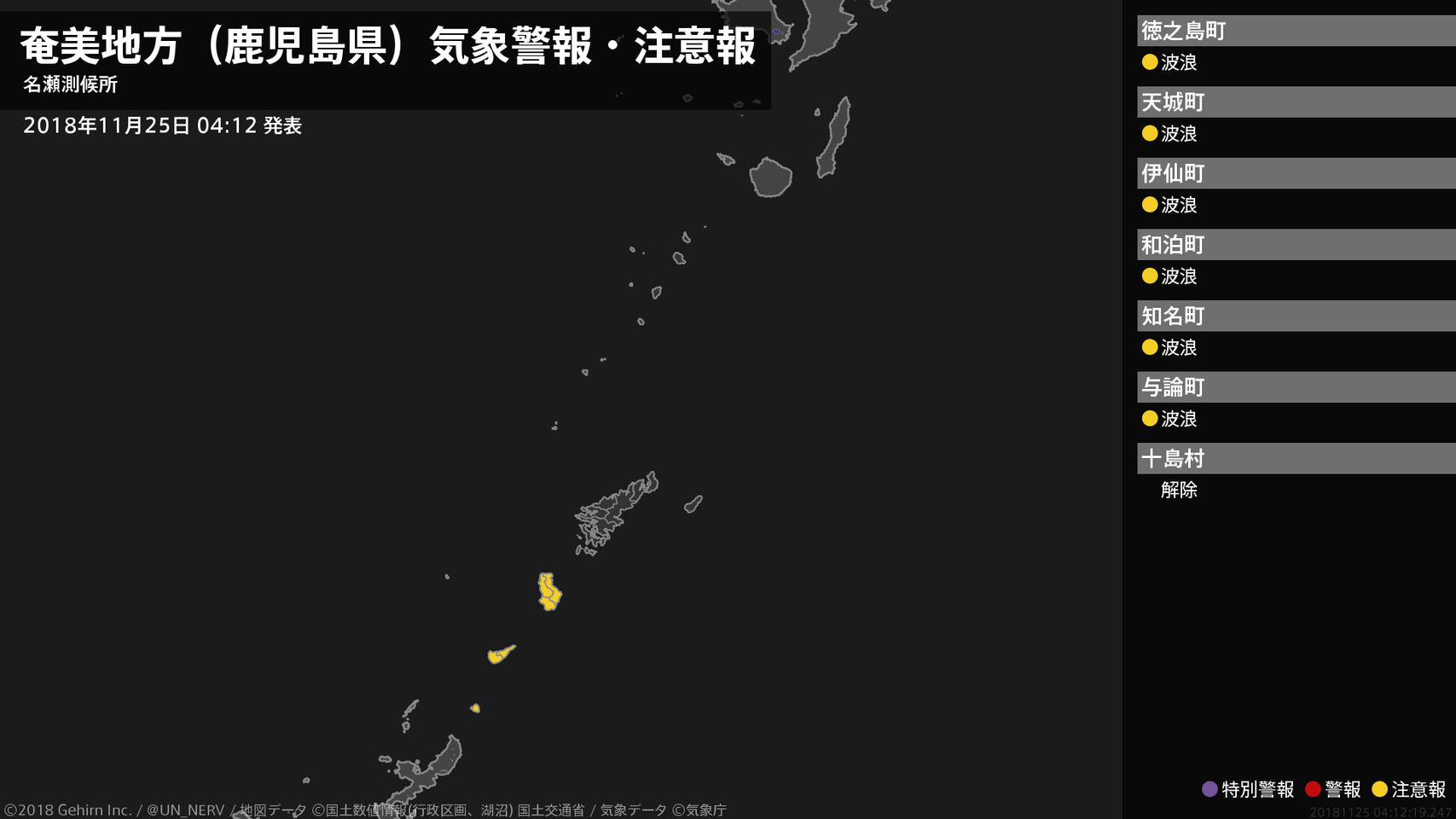 【奄美地方(鹿児島県) 気象警報・注意報 2018年11月25日 04:12】奄美地方では、高波に注意してください。#気象警報注意報 #奄美地方
