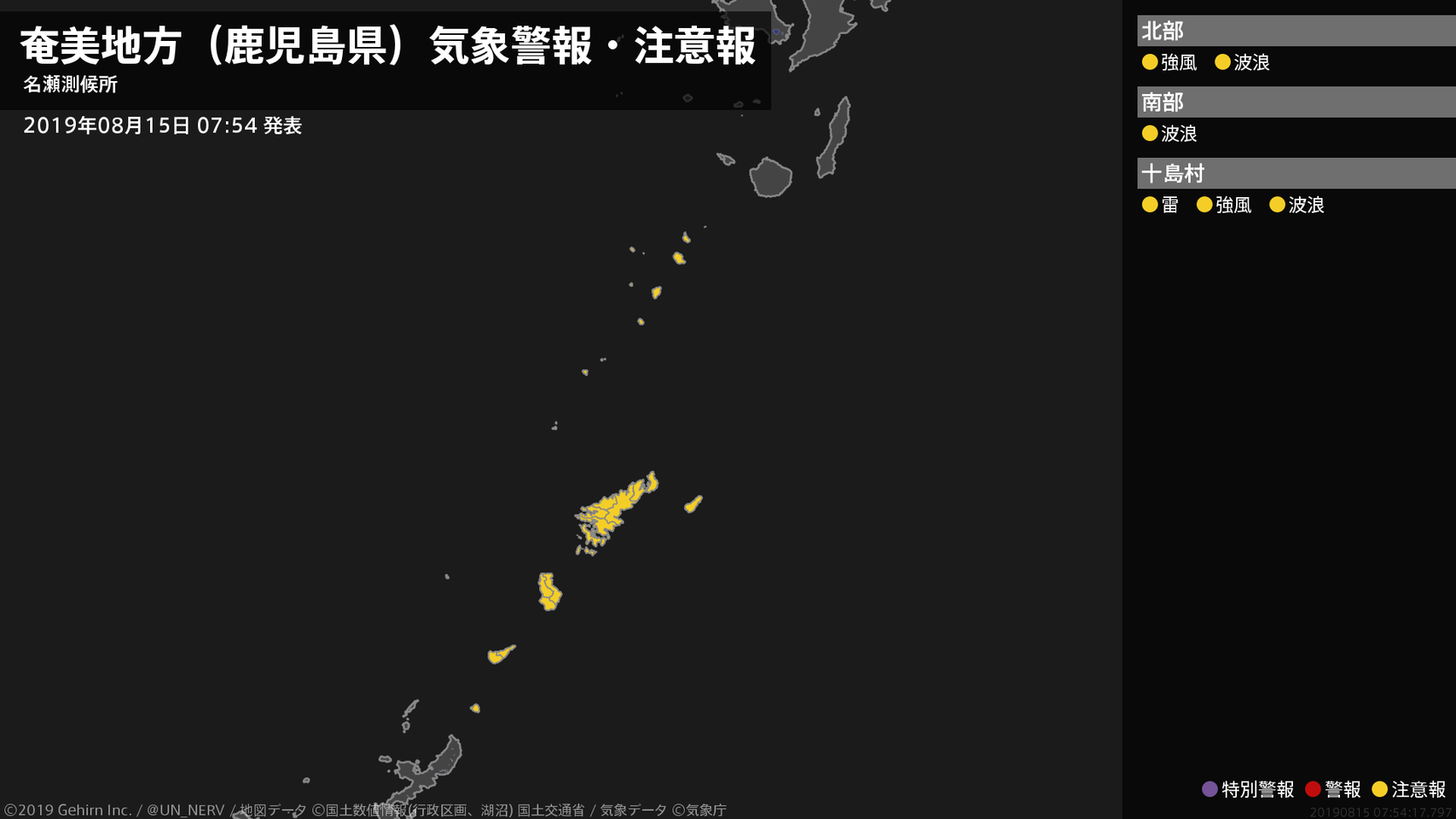 【奄美地方(鹿児島県) 気象警報・注意報 2019年08月15日 07:54】奄美地方では、15日夕方まで強風に、16日朝まで高波に、15日昼前まで急な強い雨や落雷に注意してください。#気象警報注意報 #奄美地方