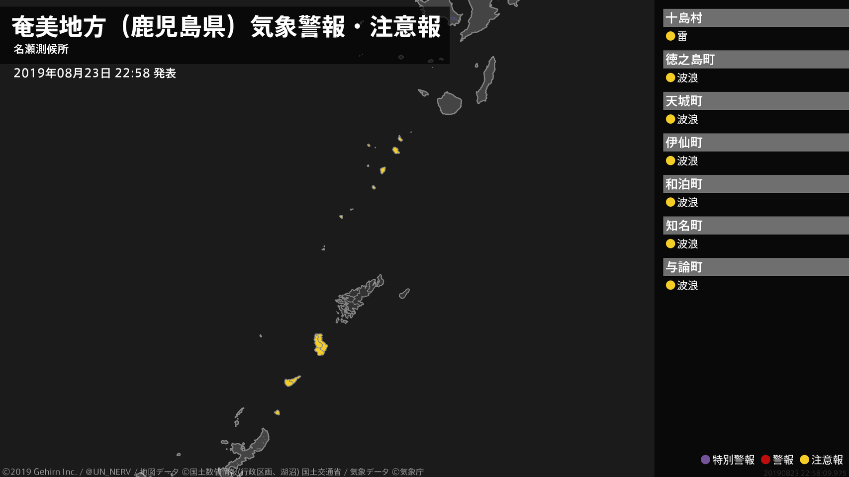 【奄美地方(鹿児島県) 気象警報・注意報 2019年08月23日 22:58】