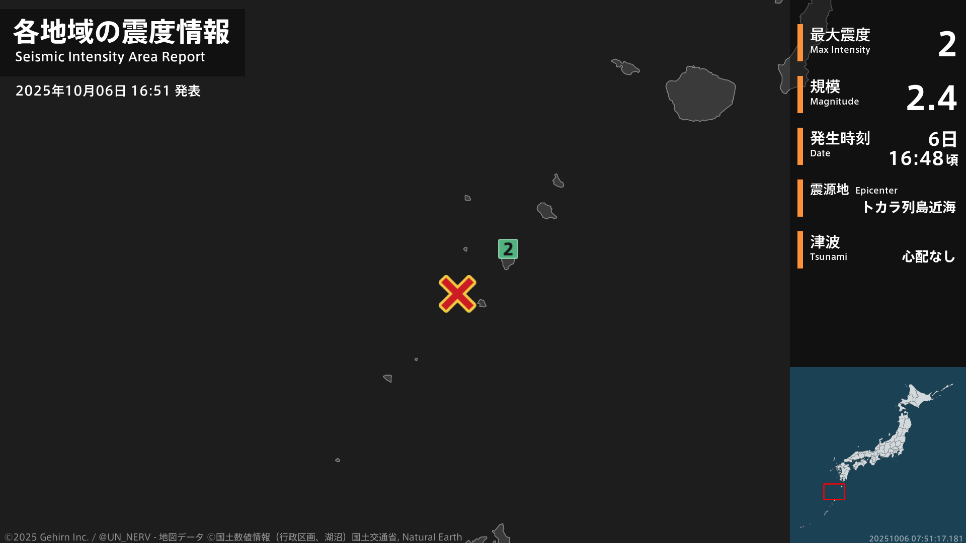 【地震情報 2025年10月6日】16時48分頃、トカラ列島近海を震源とする地震がありました。震源の深さは約30km、地震の規模はM2.4、最大震度2を鹿児島県で観測しています。この地震による津波の心配はありません。#地震 #鹿児島県