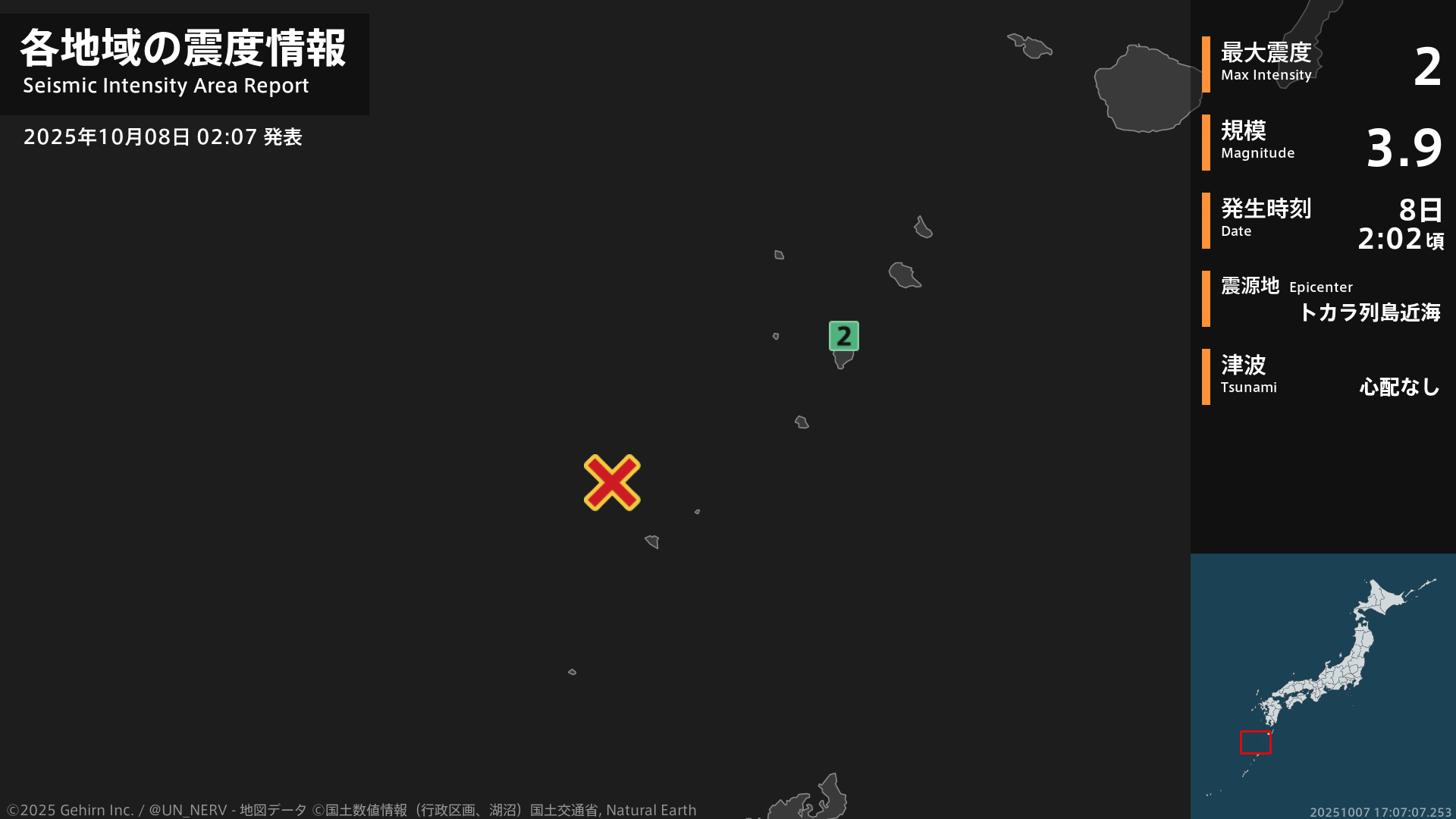 【地震情報 2025年10月8日】2時2分頃、トカラ列島近海を震源とする地震がありました。震源の深さは約10km、地震の規模はM3.9、最大震度2を鹿児島県で観測しています。この地震による津波の心配はありません。#地震 #鹿児島県
