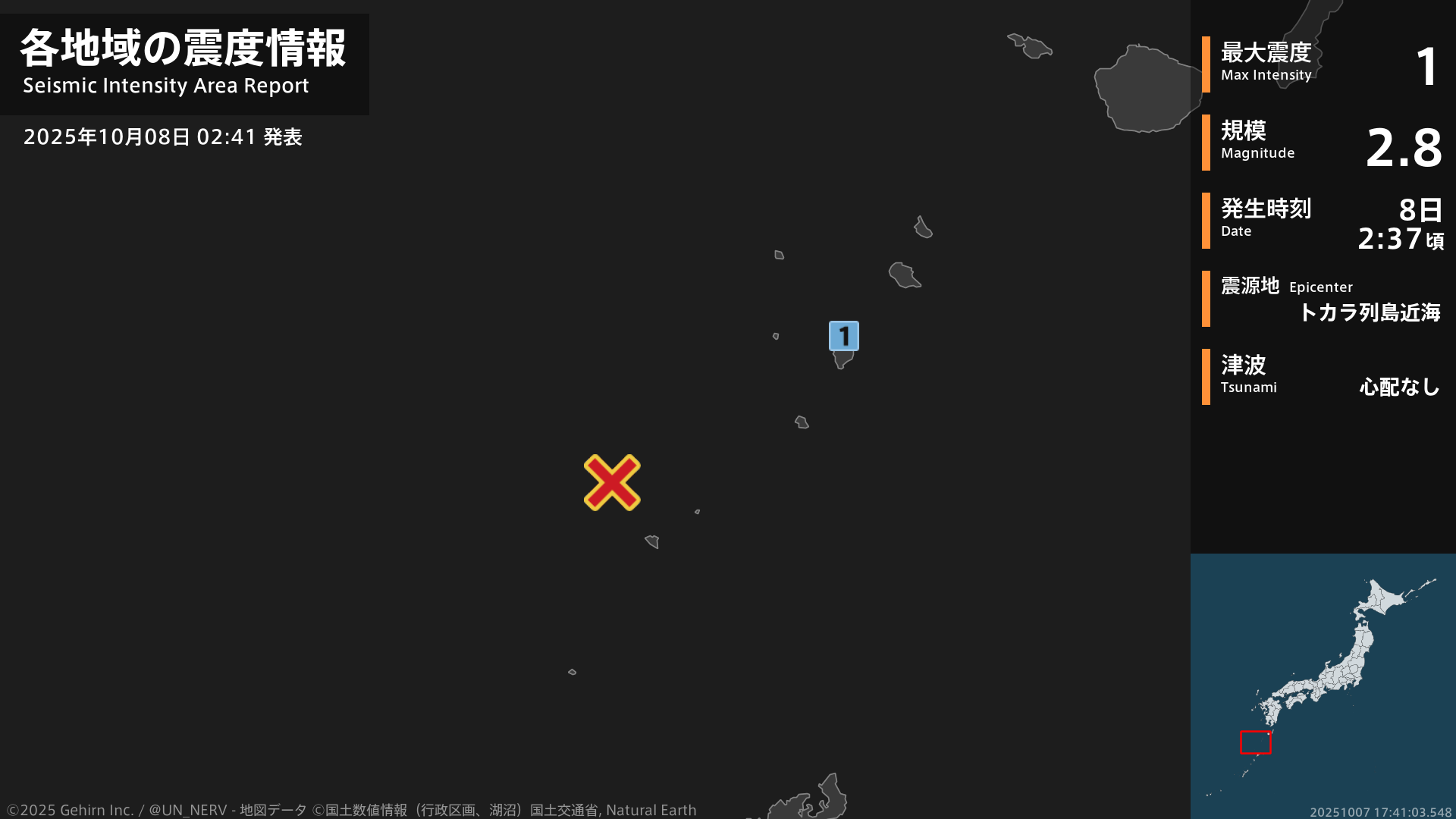 【地震情報 2025年10月8日】2時15分頃、トカラ列島近海を震源とする地震がありました。震源の深さは約10km、地震の規模はM1.7、最大震度1を鹿児島県で観測しています。この地震による津波の心配はありません。#地震 #鹿児島県