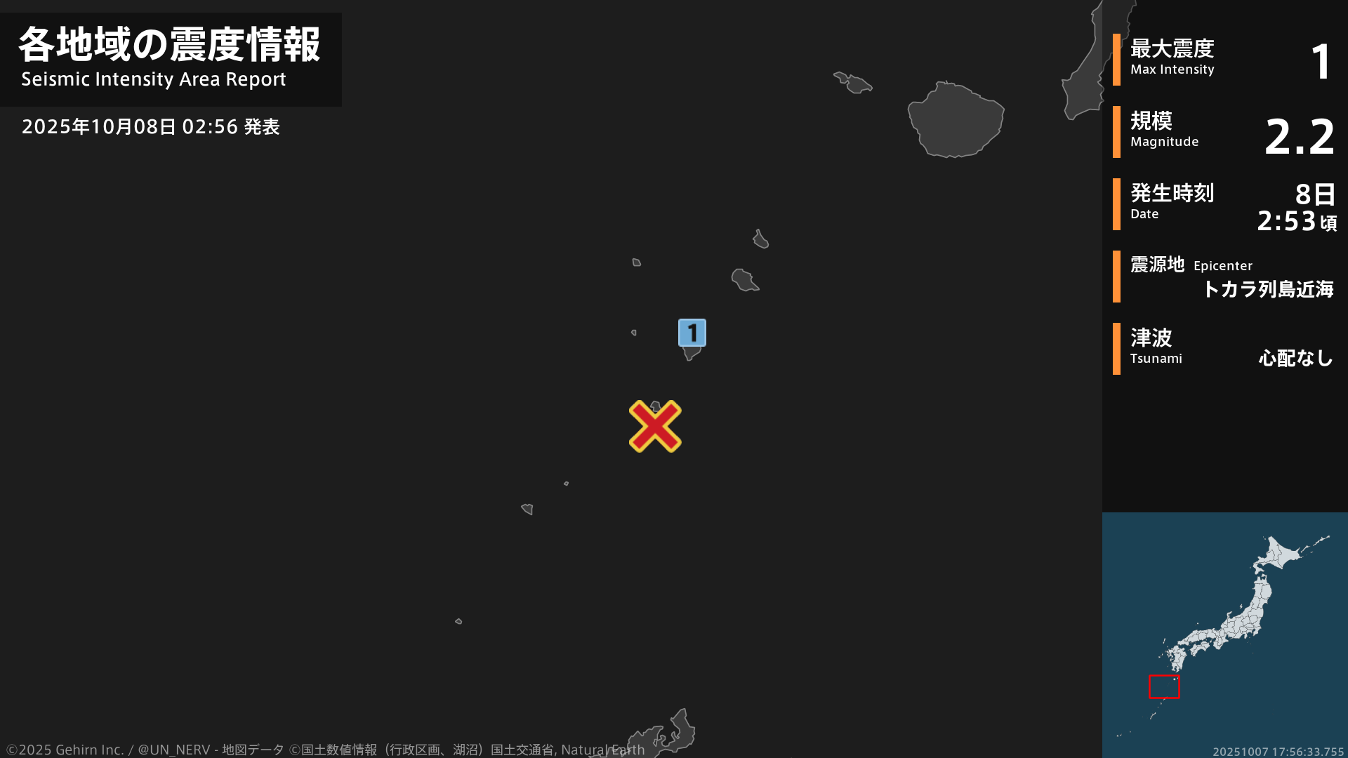 【地震情報 2025年10月8日】2時53分頃、トカラ列島近海を震源とする地震がありました。震源の深さは約20km、地震の規模はM2.2、最大震度1を鹿児島県で観測しています。この地震による津波の心配はありません。#地震 #鹿児島県
