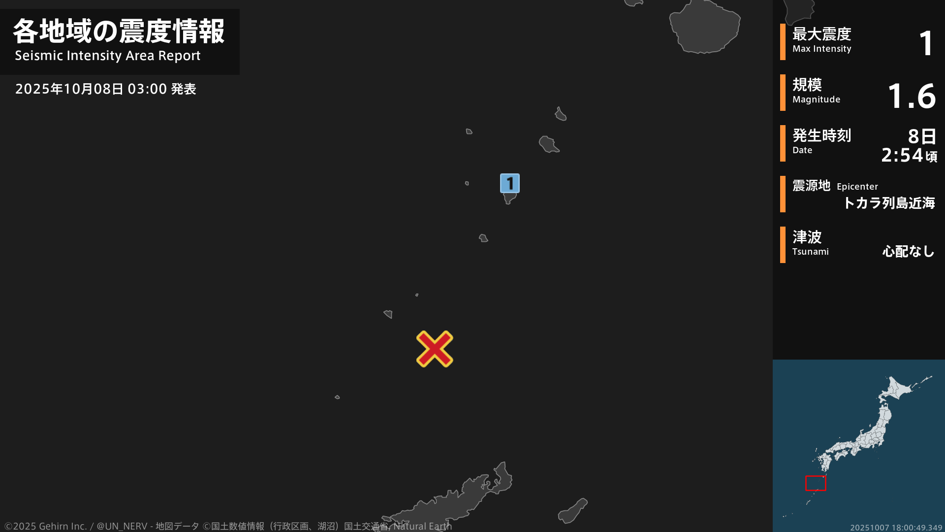 【地震情報 2025年10月8日】2時54分頃、トカラ列島近海を震源とする地震がありました。震源の深さは約10km、地震の規模はM1.6、最大震度1を鹿児島県で観測しています。この地震による津波の心配はありません。#地震 #鹿児島県