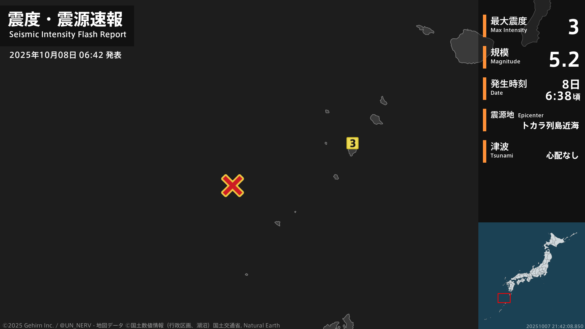 【地震情報 2025年10月8日】6時38分頃、トカラ列島近海を震源とする地震がありました。震源の深さはごく浅い、地震の規模はM5.2、最大震度3を鹿児島県で観測しています。この地震による津波の心配はありません。#地震 #鹿児島県