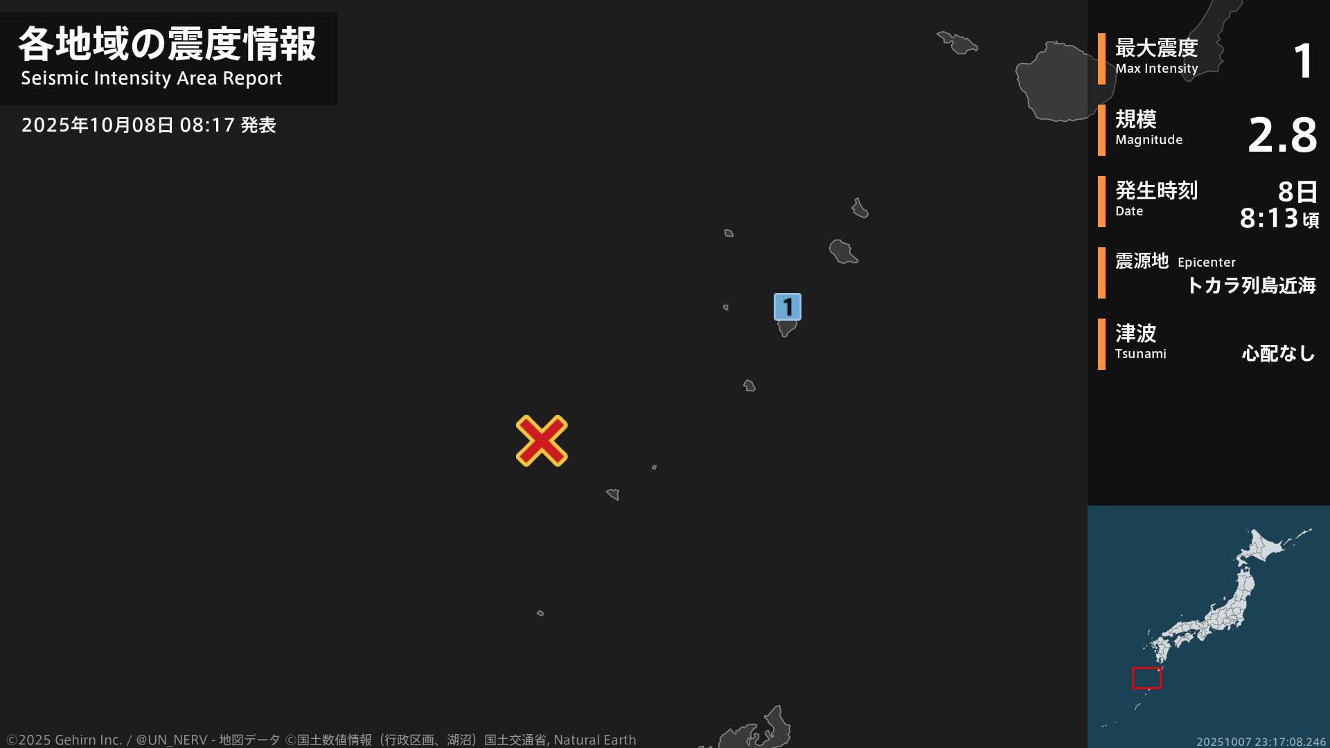 【地震情報 2025年10月8日】8時13分頃、トカラ列島近海を震源とする地震がありました。震源の深さはごく浅い、地震の規模はM2.8、最大震度1を鹿児島県で観測しています。この地震による津波の心配はありません。#地震 #鹿児島県