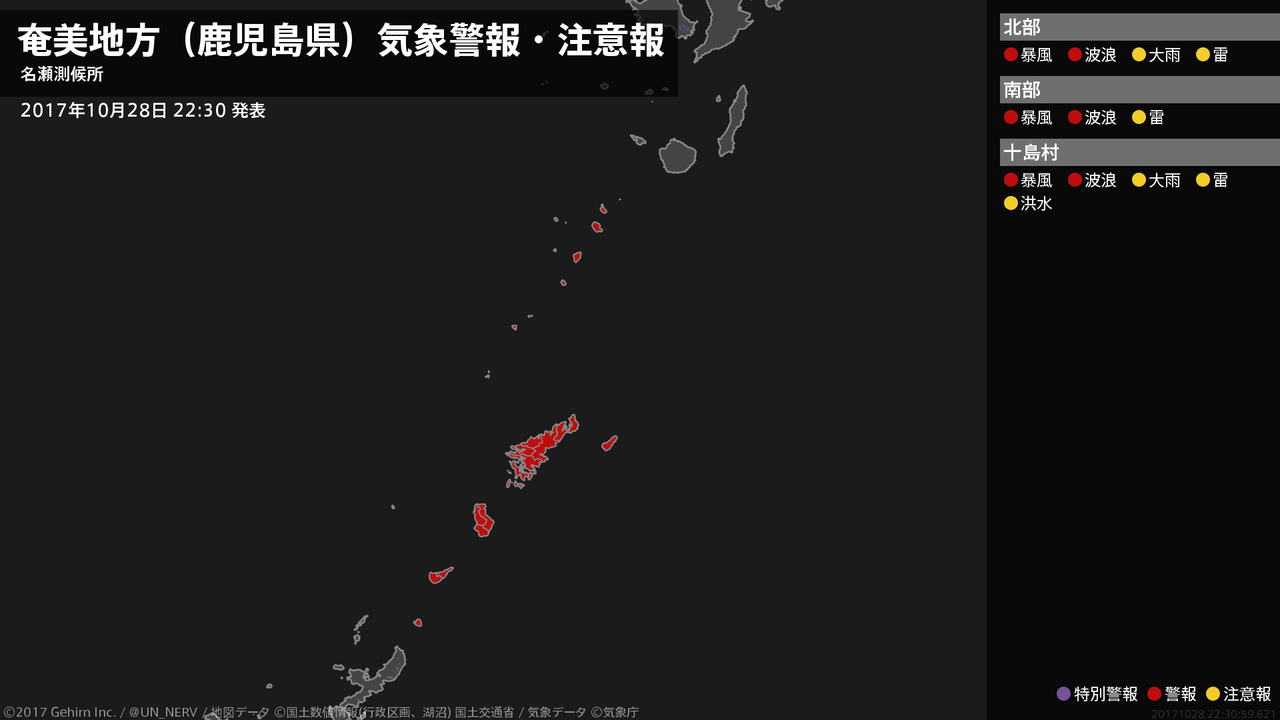【奄美地方(鹿児島県) 気象警報・注意報 2017年10月28日 22:31】奄美地方では、29日朝まで暴風に、29日昼過ぎまで高波に警戒してください。#気象警報注意報 #奄美地方