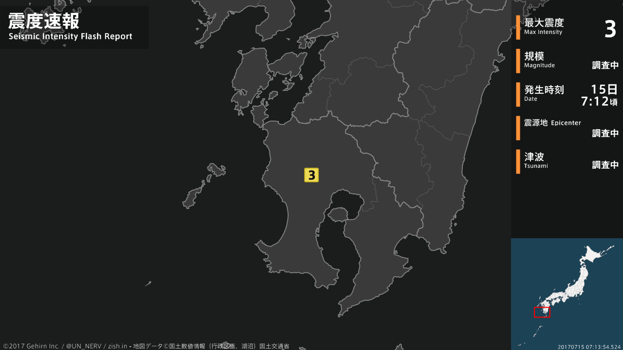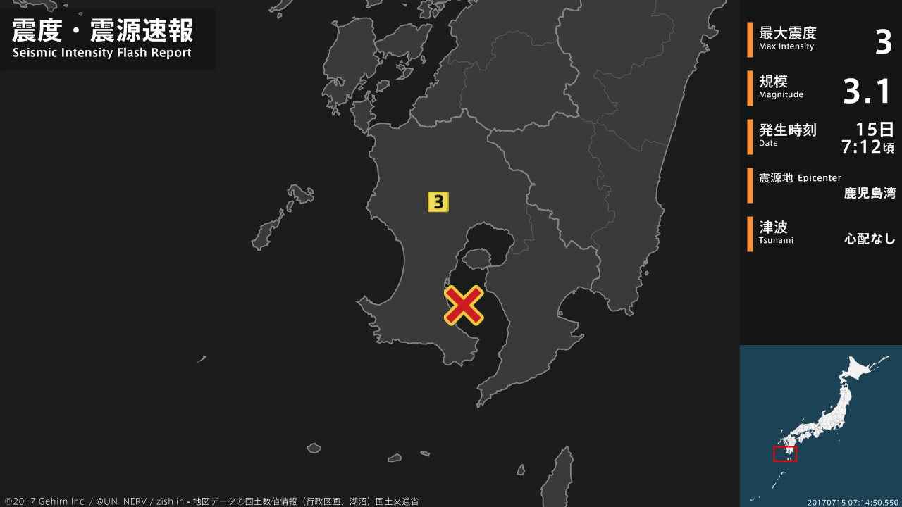 15日07時12分頃、鹿児島湾を震源とする地震がありました。震源の深さは約10km、地震の規模はM3.1と推定されています。この地震による津波の心配はありません。