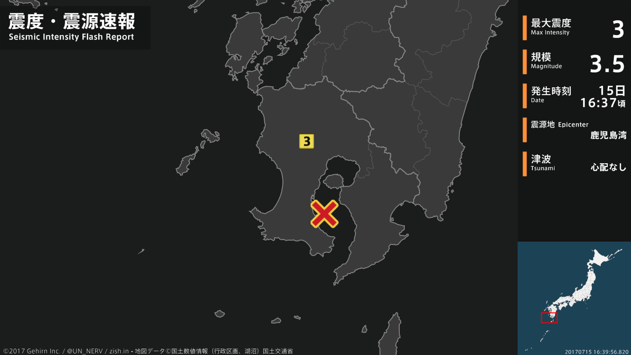 15日16時37分頃、鹿児島湾を震源とする地震がありました。震源の深さは約10km、地震の規模はM3.5と推定されています。この地震による津波の心配はありません。