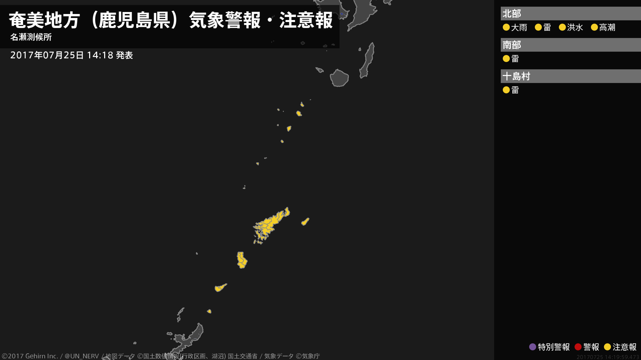 【奄美地方(鹿児島県) 気象警報・注意報 2017年07月25日 14:20】奄美地方では、低い土地の浸水や河川の増水、高潮、落雷に注意してください。#気象警報注意報 #奄美地方