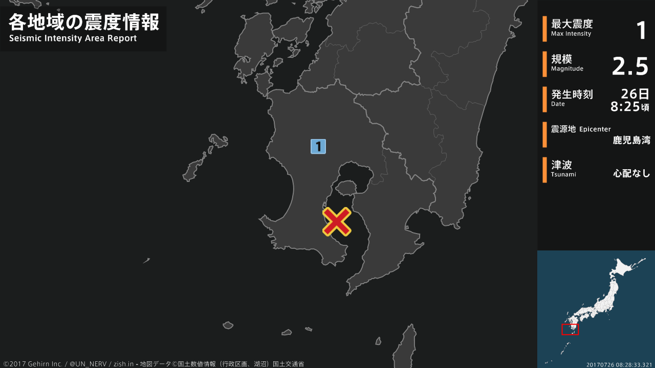 【地震情報 2017年7月26日】08時25分頃、鹿児島湾を震源とする地震がありました。震源の深さは約10km、地震の規模はM2.5、最大震度1を鹿児島県で観測しています。この地震による津波の心配はありません。#地震 #鹿児島県
