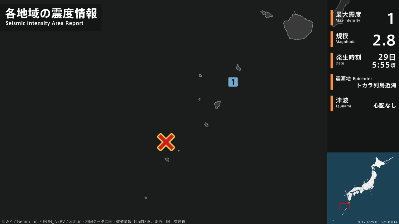 【地震情報 2017年7月29日】05時55分頃、トカラ列島近海を震源とする地震がありました。震源の深さは約20km、地震の規模はM2.8、最大震度1を鹿児島県で観測しています。この地震による津波の心配はありません。#地震 #鹿児島県