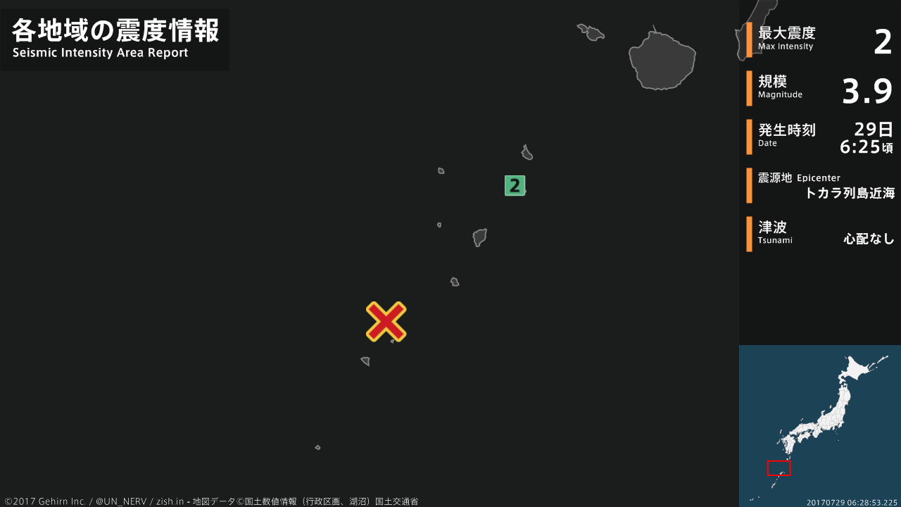 【地震情報 2017年7月29日】06時25分頃、トカラ列島近海を震源とする地震がありました。震源の深さは約20km、地震の規模はM3.9、最大震度2を鹿児島県で観測しています。この地震による津波の心配はありません。#地震 #鹿児島県
