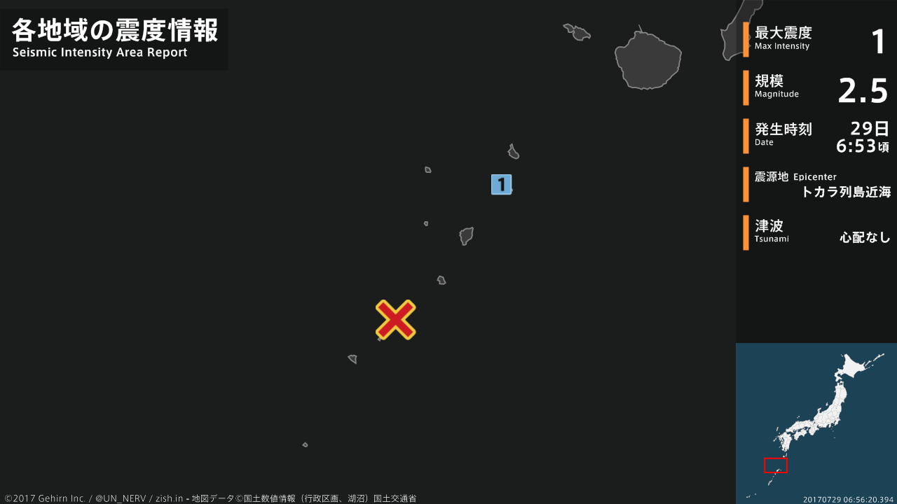 【地震情報 2017年7月29日】06時53分頃、トカラ列島近海を震源とする地震がありました。震源の深さは約20km、地震の規模はM2.5、最大震度1を鹿児島県で観測しています。この地震による津波の心配はありません。#地震 #鹿児島県