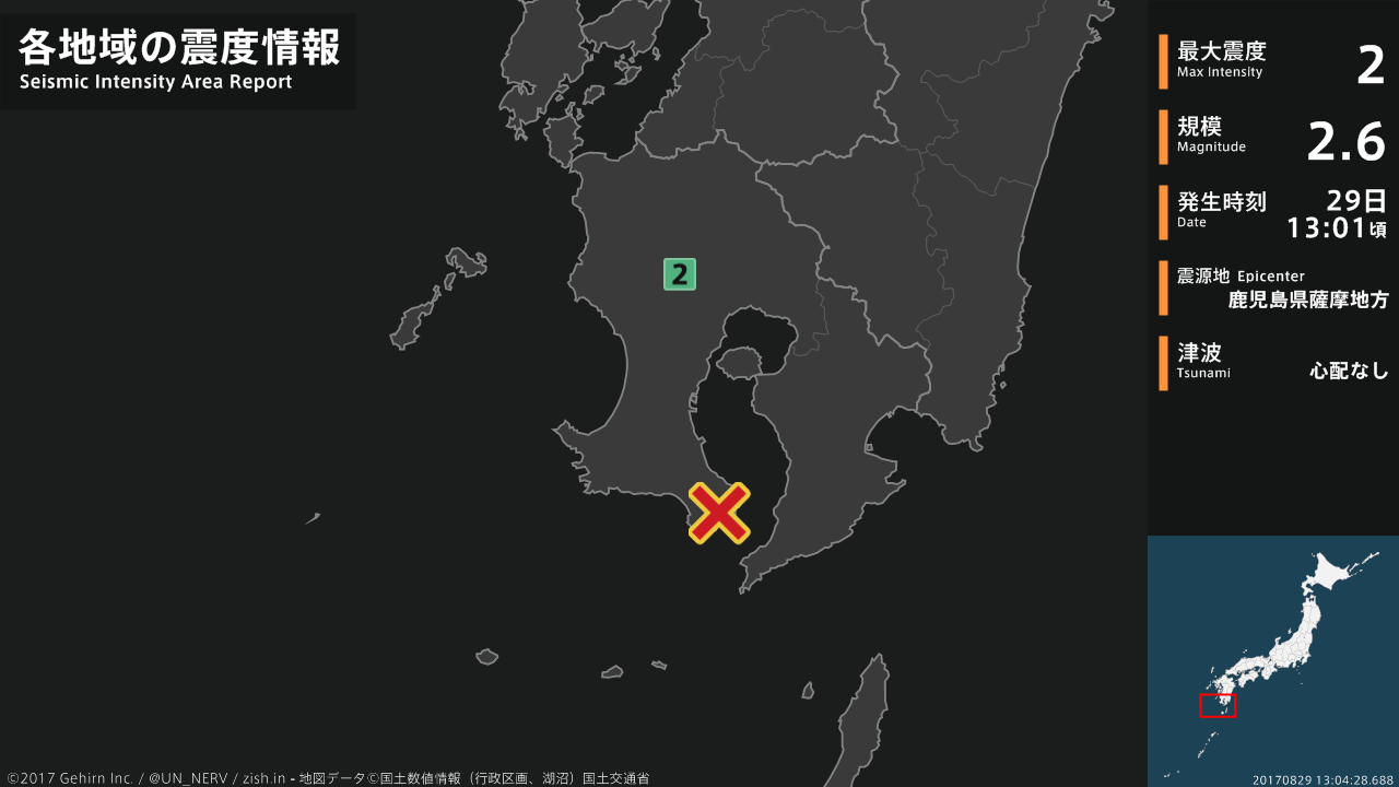 【地震情報 2017年8月29日】13時01分頃、鹿児島県薩摩地方を震源とする地震がありました。震源の深さはごく浅い、地震の規模はM2.6、最大震度2を鹿児島県で観測しています。この地震による津波の心配はありません。#地震 #鹿児島県