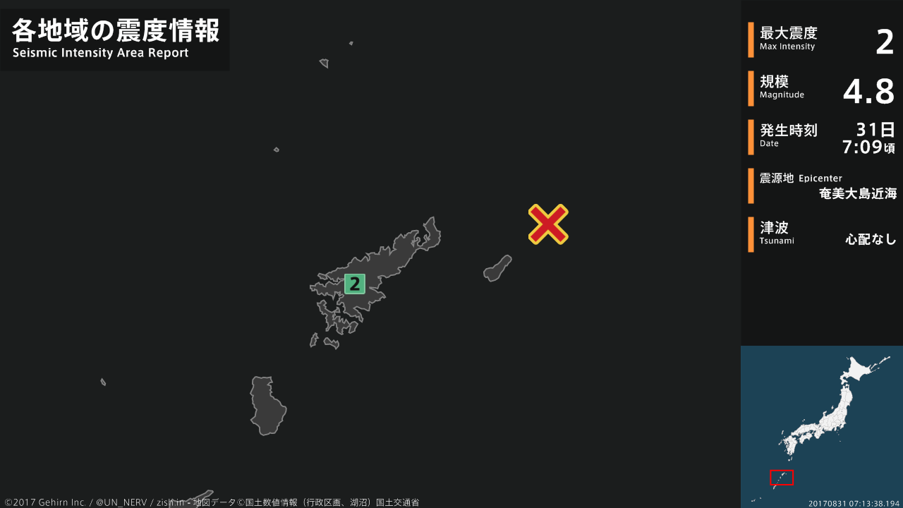 【地震情報 2017年8月31日】07時09分頃、奄美大島近海を震源とする地震がありました。震源の深さは約20km、地震の規模はM4.8、最大震度2を鹿児島県で観測しています。この地震による津波の心配はありません。#地震 #鹿児島県