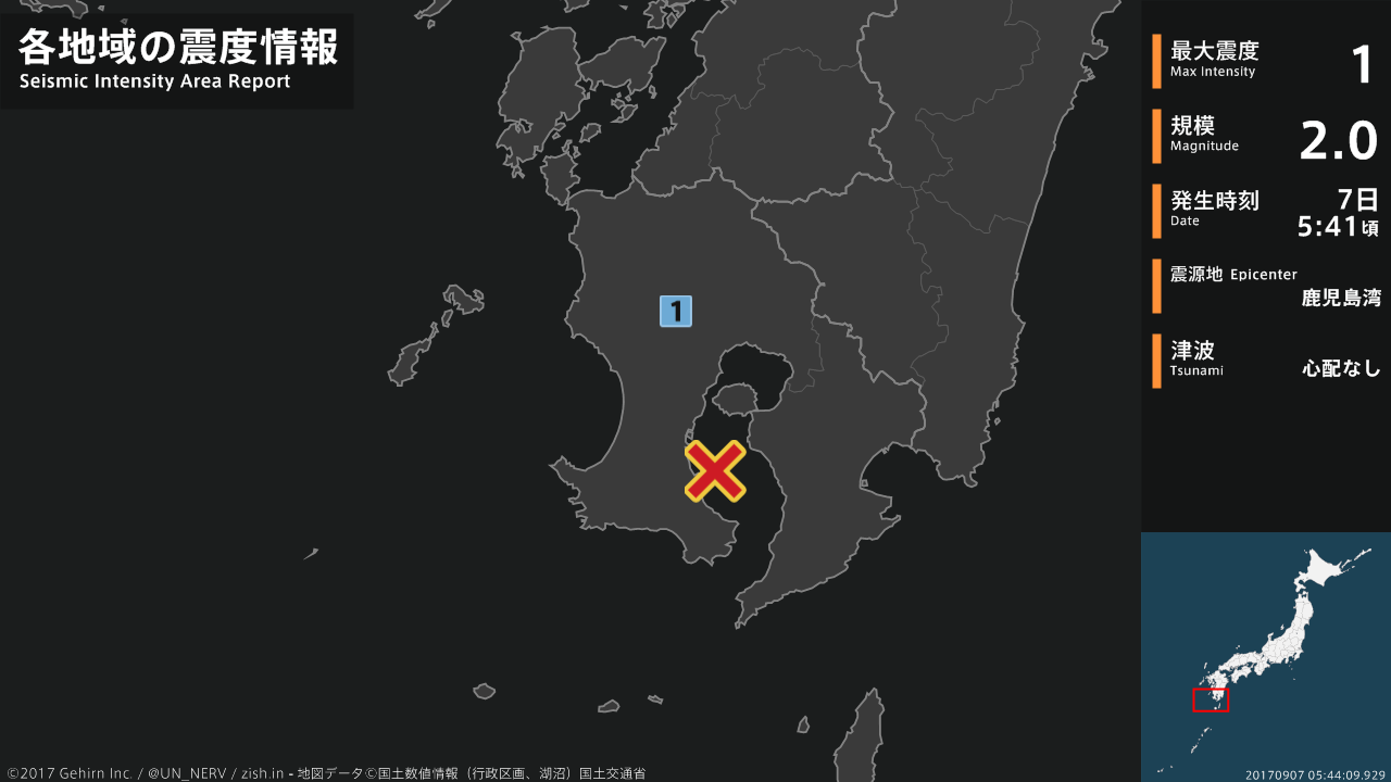 【地震情報 2017年9月7日】05時41分頃、鹿児島湾を震源とする地震がありました。震源の深さは約10km、地震の規模はM2.0、最大震度1を鹿児島県で観測しています。この地震による津波の心配はありません。#地震 #鹿児島県