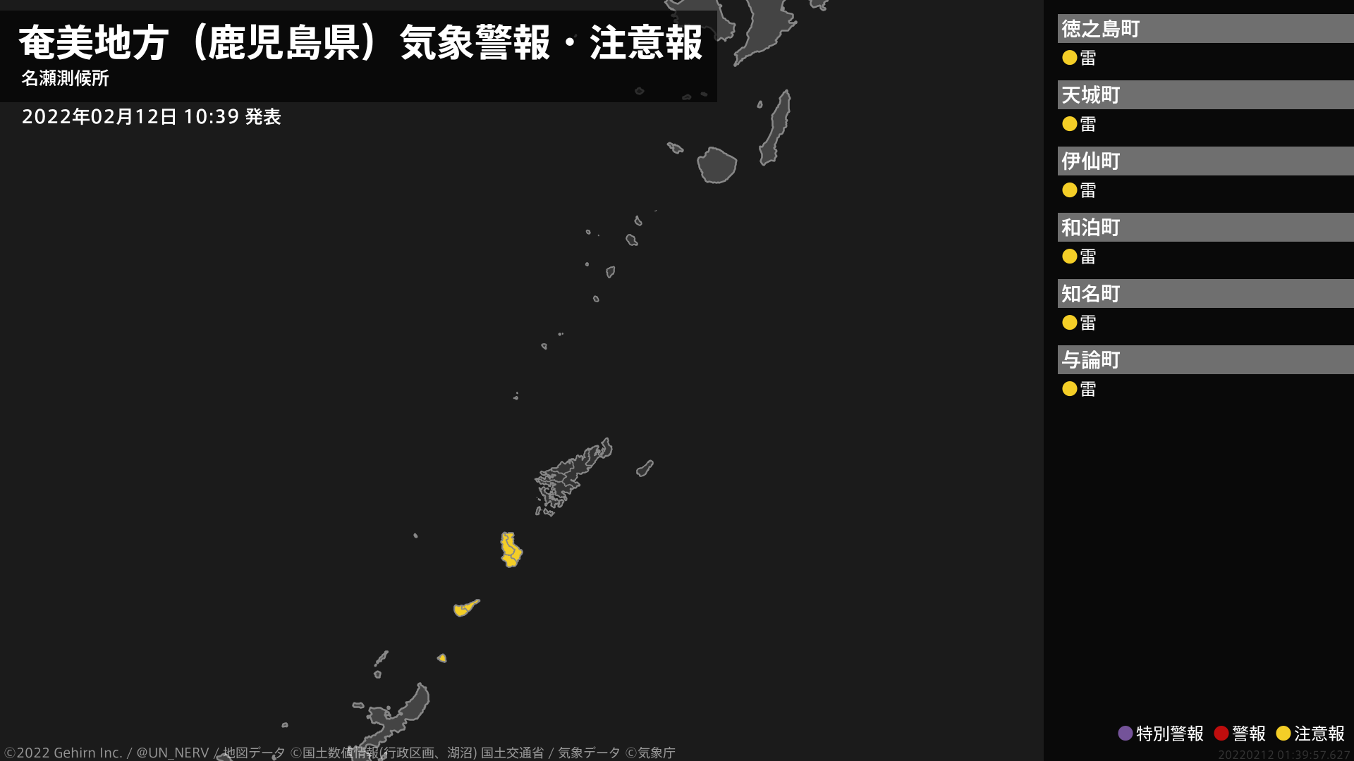 【奄美地方(鹿児島県) 気象警報・注意報 2022年02月12日 10:39】奄美地方では、12日夕方まで急な強い雨や落雷に注意してください。#気象警報注意報 #奄美地方