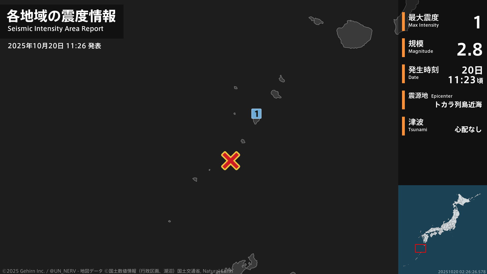 【地震情報 2025年10月20日】11時23分頃、トカラ列島近海を震源とする地震がありました。震源の深さは約20km、地震の規模はM2.8、最大震度1を鹿児島県で観測しています。この地震による津波の心配はありません。#地震 #鹿児島県