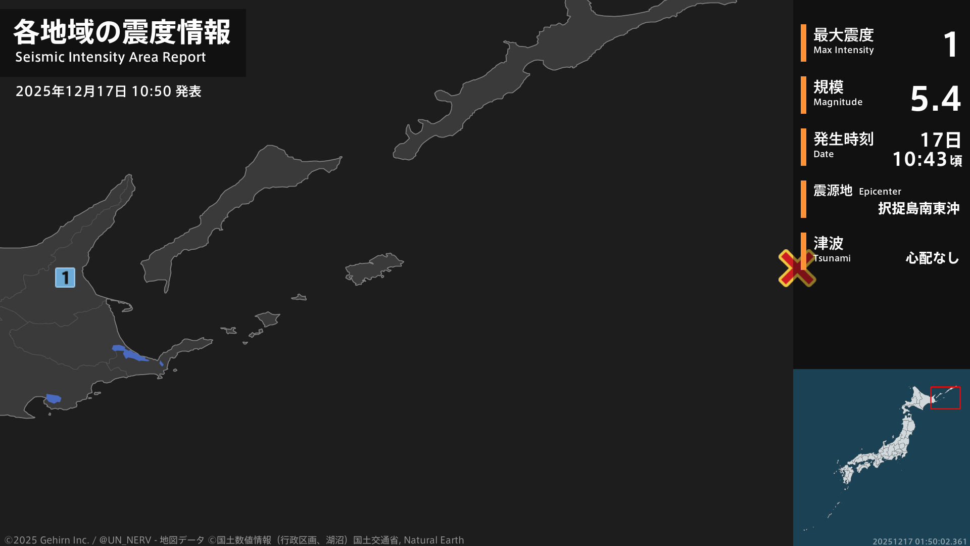 10時43分頃、択捉島南東沖を震源とする地震がありました。震源の深さは約10km、地震の規模はM5.4、最大震度1を北海道で観測しています。この地震による津波の心配はありません。