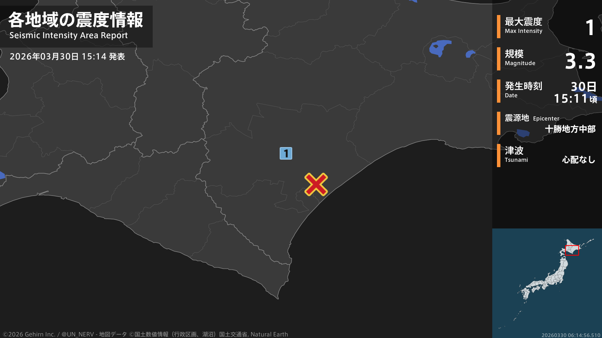 【地震情報 2026年3月30日】15時11分頃、十勝地方中部を震源とする地震がありました。震源の深さは約70km、地震の規模はM3.3、最大震度1を北海道で観測しています。この地震による津波の心配はありません。#地震 #北海道