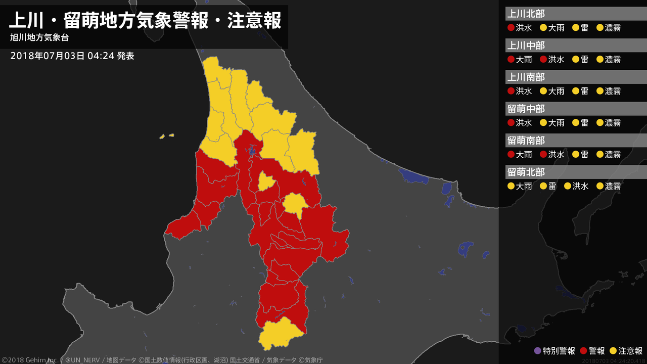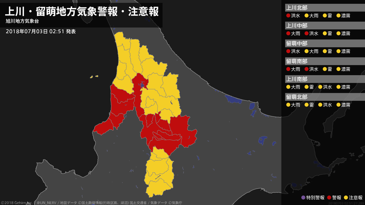 【上川・留萌地方 気象警報・注意報 2018年07月03日 02:51】
