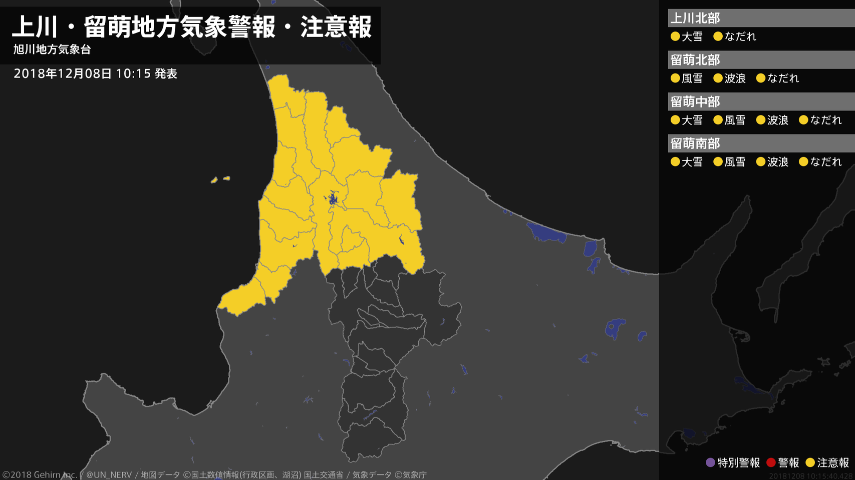【上川・留萌地方 気象警報・注意報 2018年12月08日 10:15】留萌地方では、風雪や高波に注意してください。上川、留萌地方では、大雪やなだれに注意してください。#気象警報注意報 #上川地方 #留萌地方