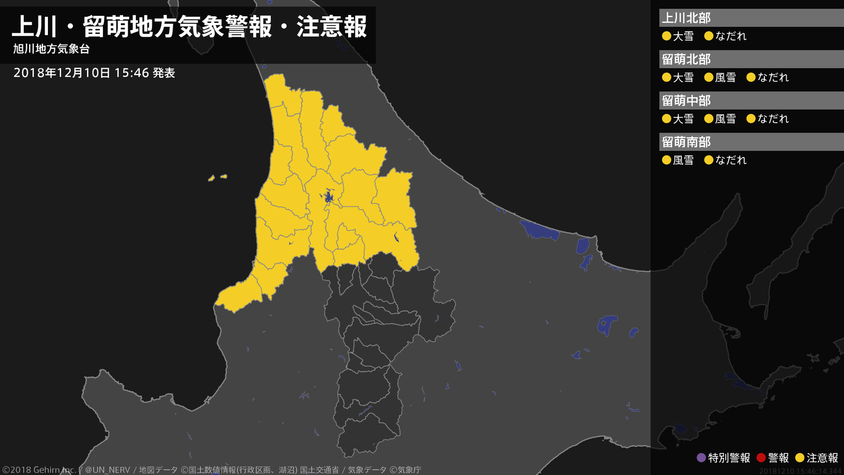 【上川・留萌地方 気象警報・注意報 2018年12月10日 15:46】留萌地方では、11日昼前まで風雪に注意してください。上川、留萌地方では、10日夜のはじめ頃から11日昼前まで大雪に、11日までなだれに注意してください。#気象警報注意報 #上川地方 #留萌地方