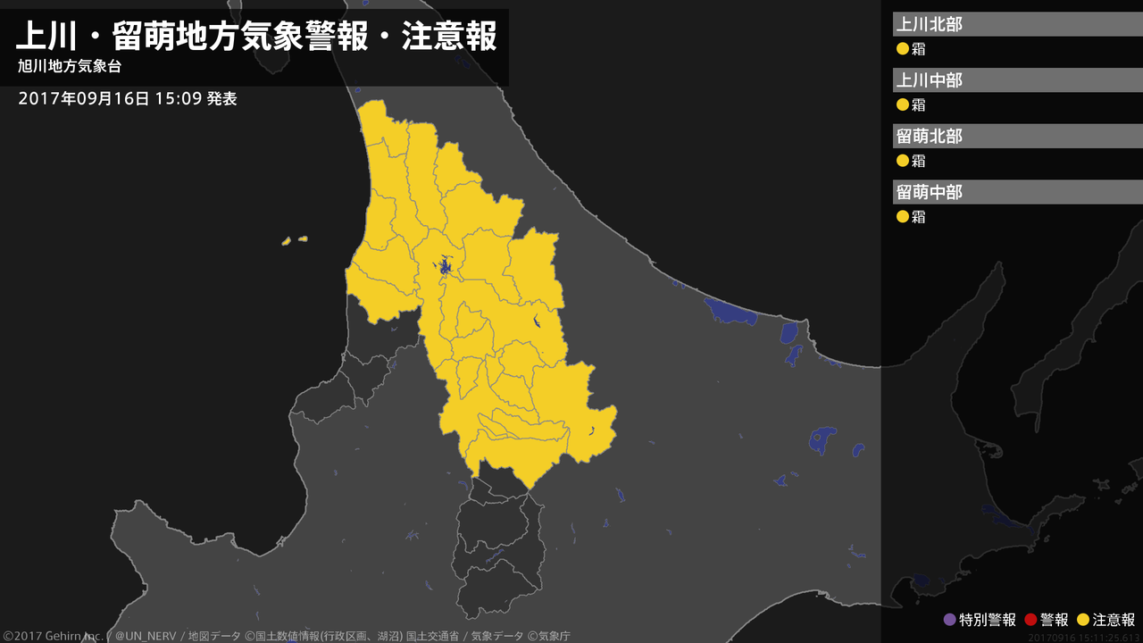 【上川・留萌地方 気象警報・注意報 2017年09月16日 15:11】上川、留萌地方では、17日朝は霜に対する農作物の管理に注意してください。#気象警報注意報 #上川地方 #留萌地方