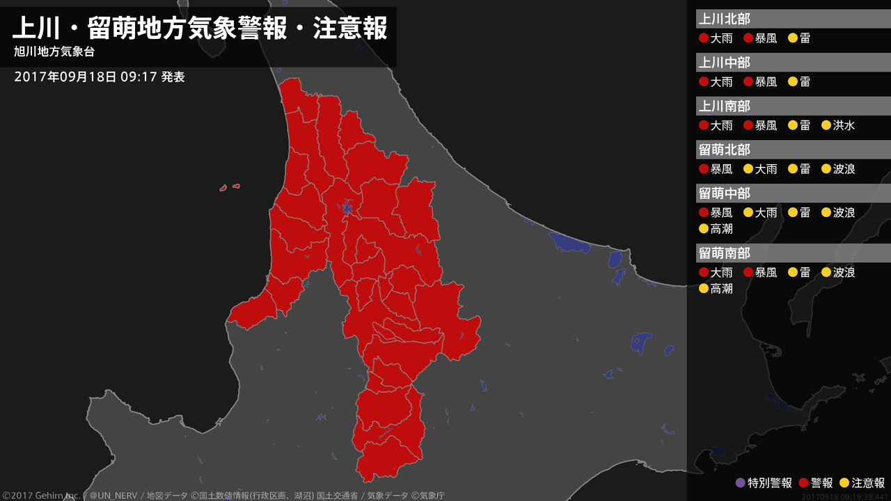 【上川・留萌地方 気象警報 2017年09月18日 09:19】上川、留萌地方では、18日昼過ぎから18日夕方まで低い土地の浸水に、18日夜遅くまで暴風に警戒してください。#気象警報 #気象警報注意報 #上川地方 #留萌地方