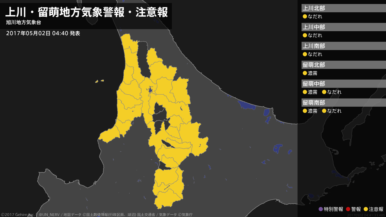 【上川・留萌地方 気象警報・注意報 2017年05月02日 04:41】留萌地方では、2日昼前まで濃霧による視程障害に注意してください。上川、留萌地方では、ここしばらくなだれに注意してください。#気象警報注意報 #上川地方 #留萌地方