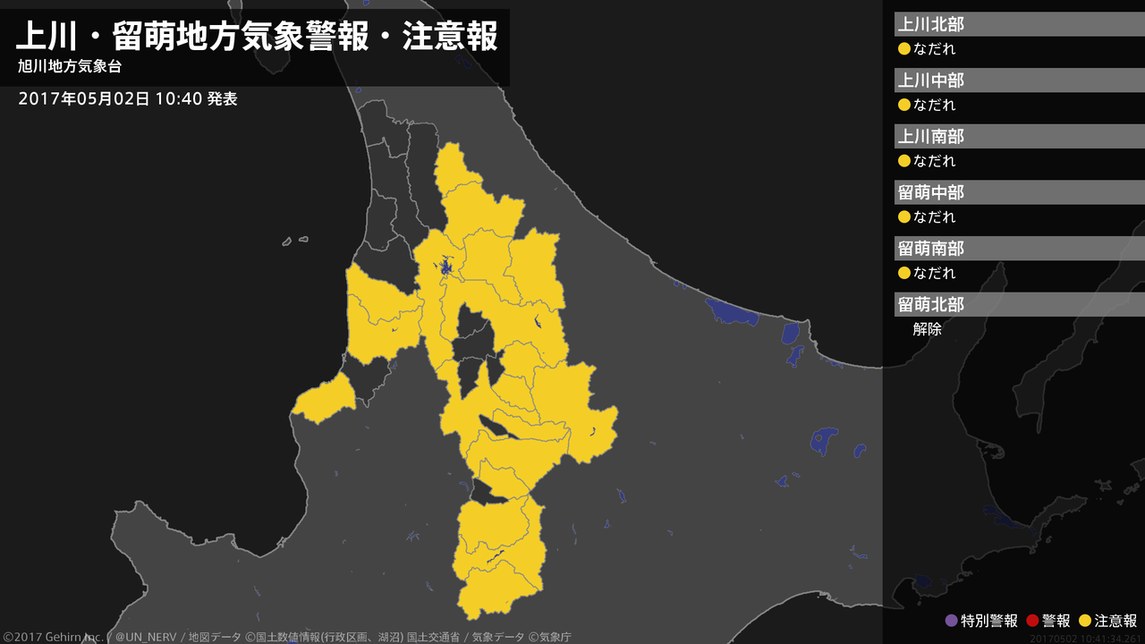 【上川・留萌地方 気象警報・注意報 2017年05月02日 10:41】上川、留萌地方では、ここしばらくなだれに注意してください。#気象警報注意報 #上川地方 #留萌地方