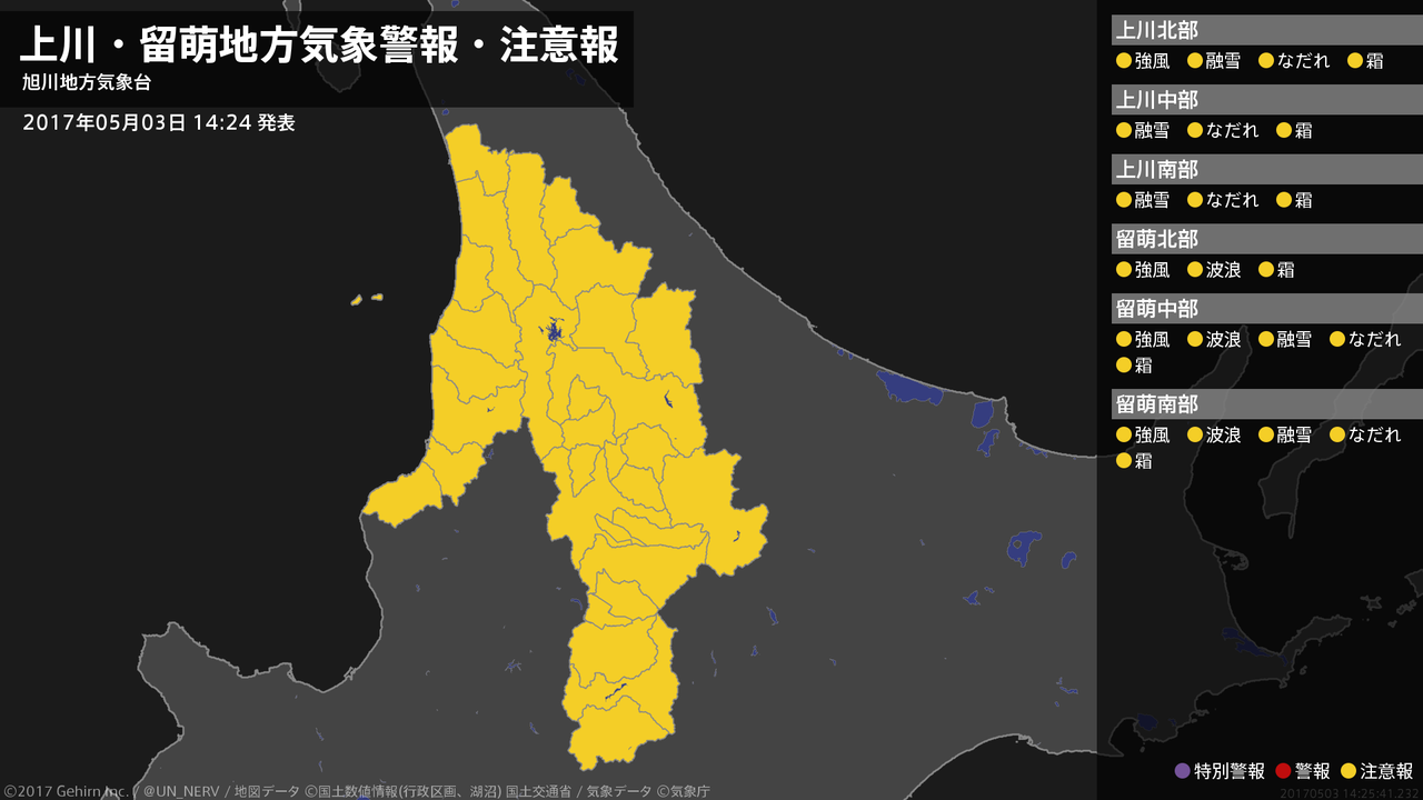 【上川・留萌地方 気象警報・注意報 2017年05月03日 20:05】留萌地方では、強風や高波に注意してください。上川、留萌地方では、融雪やなだれ、霜に対する農作物の管理に注意してください。#気象警報注意報 #上川地方 #留萌地方
