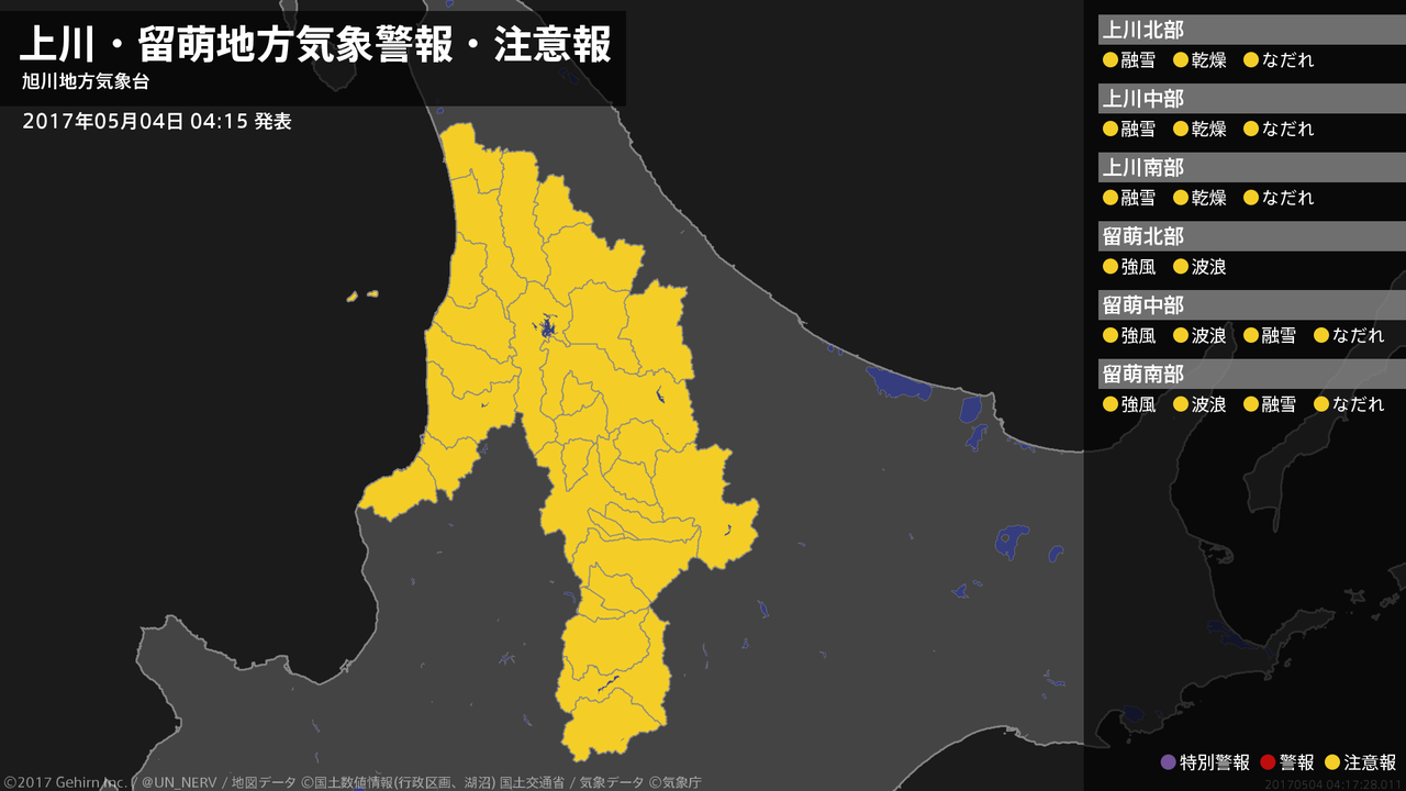 【上川・留萌地方 気象警報・注意報 2017年05月04日 16:19】留萌地方では、強風や高波に注意してください。上川、留萌地方では、融雪や空気の乾燥による火の取り扱い、なだれに注意してください。#気象警報注意報 #上川地方 #留萌地方